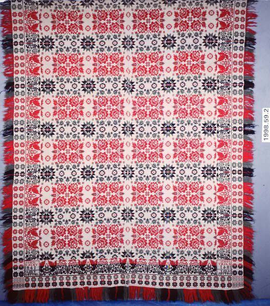 Figured coverlet; undyed and blue cotton and red, blue, and green wool, tied double cloth (Beiderwand). Center seam joins two panels. Hemmed top and bottom, with fringed applied to bottom hem. Self-fringe on sides. Central motif consists of medallions of four red rose blossoms alternating in stripes with blue and green star bursts. Border runs along the sides and bottom edge and red, green, and blue on the side edges. The corner blocks are a part of this border. The secondary border runs along the outer edge and contain a double row of stylized flowers with a diagonal block design on the corners. (The bottom border consists of one row of blue and the other green. The side borders are blue, red, and green following the color stripes of the color stripes of the main pattern.)Collection