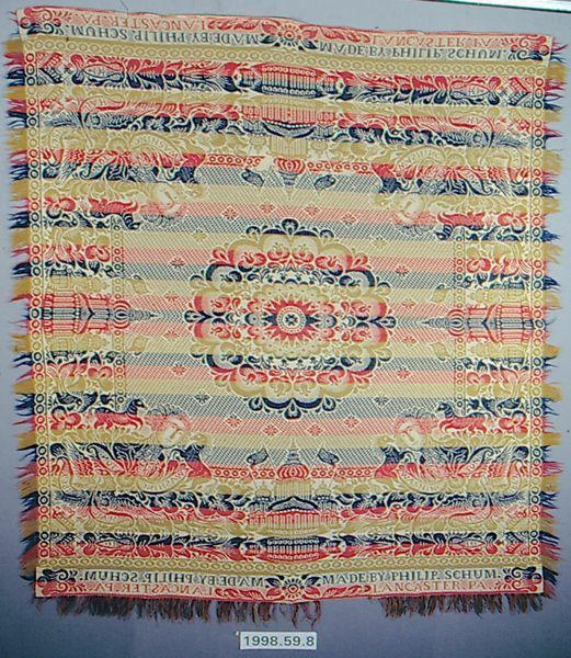 Figured coverlet; undyed cotton and red, blue, and olive wool, double cloth. Top hemmed, sides and bttom fringed. Central motif is a center medallion consisting of a center star burst design surrounded by stylized floral design. The four corners show a portrait of George Washington with a horse on either side of his head and a spread eagle beneath him. In between the portraits in the center of each side is a capitol building with a flag flying on either side of the dome. A floral/foliage design with a bird is on either side of the capitol building. Chain-like border runs along all sides; however, weavers name is at top and bottom edge.Collection