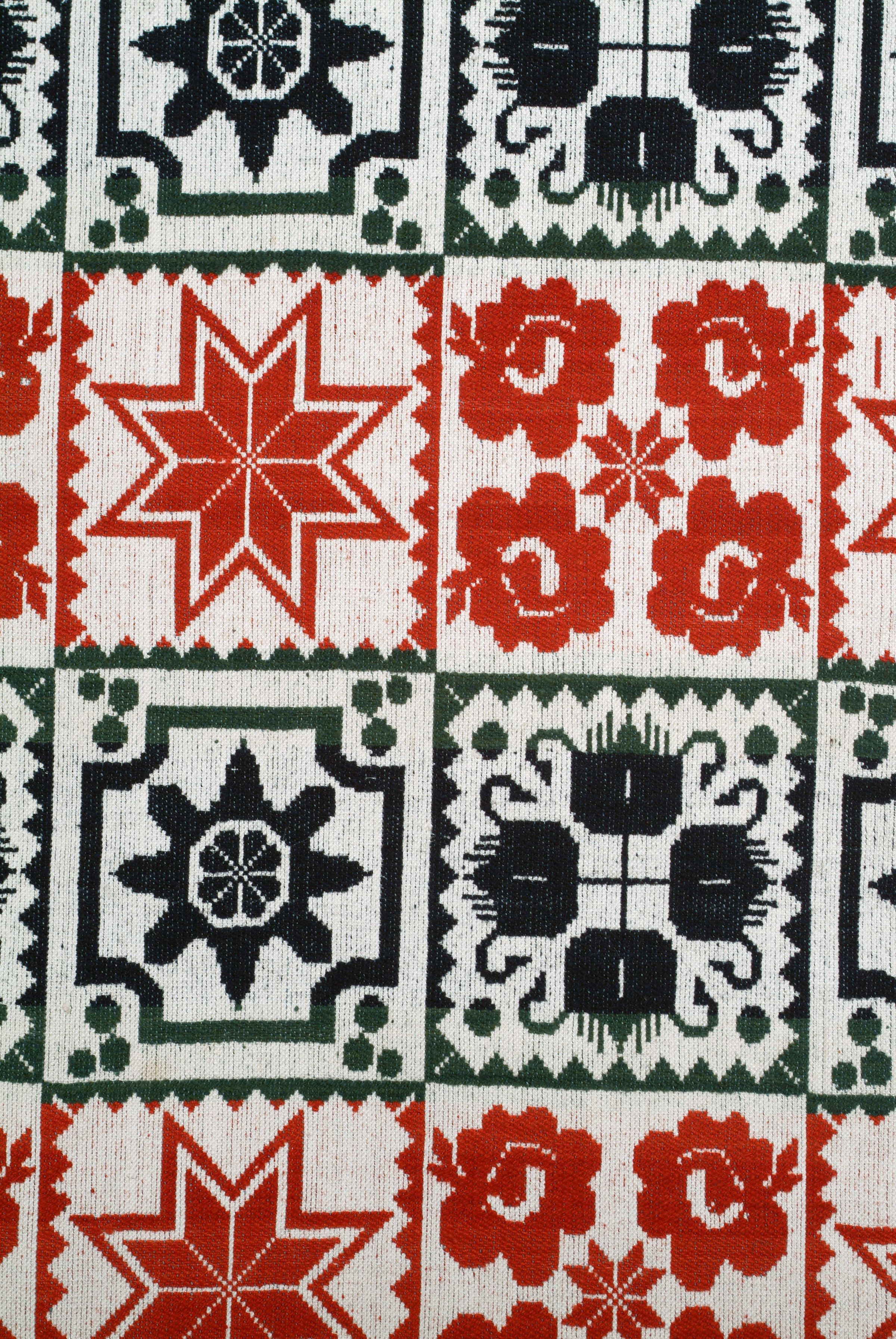 Beiderwand; navy, red, green, natural; two loom widths joined; 2 corner blocks; fringe on 3 sides; border on long sides is two rows of stars below long buildings; bottom border is floral with small buildings; centerfield is a pattern of squares with stars and flowers insideCollection
