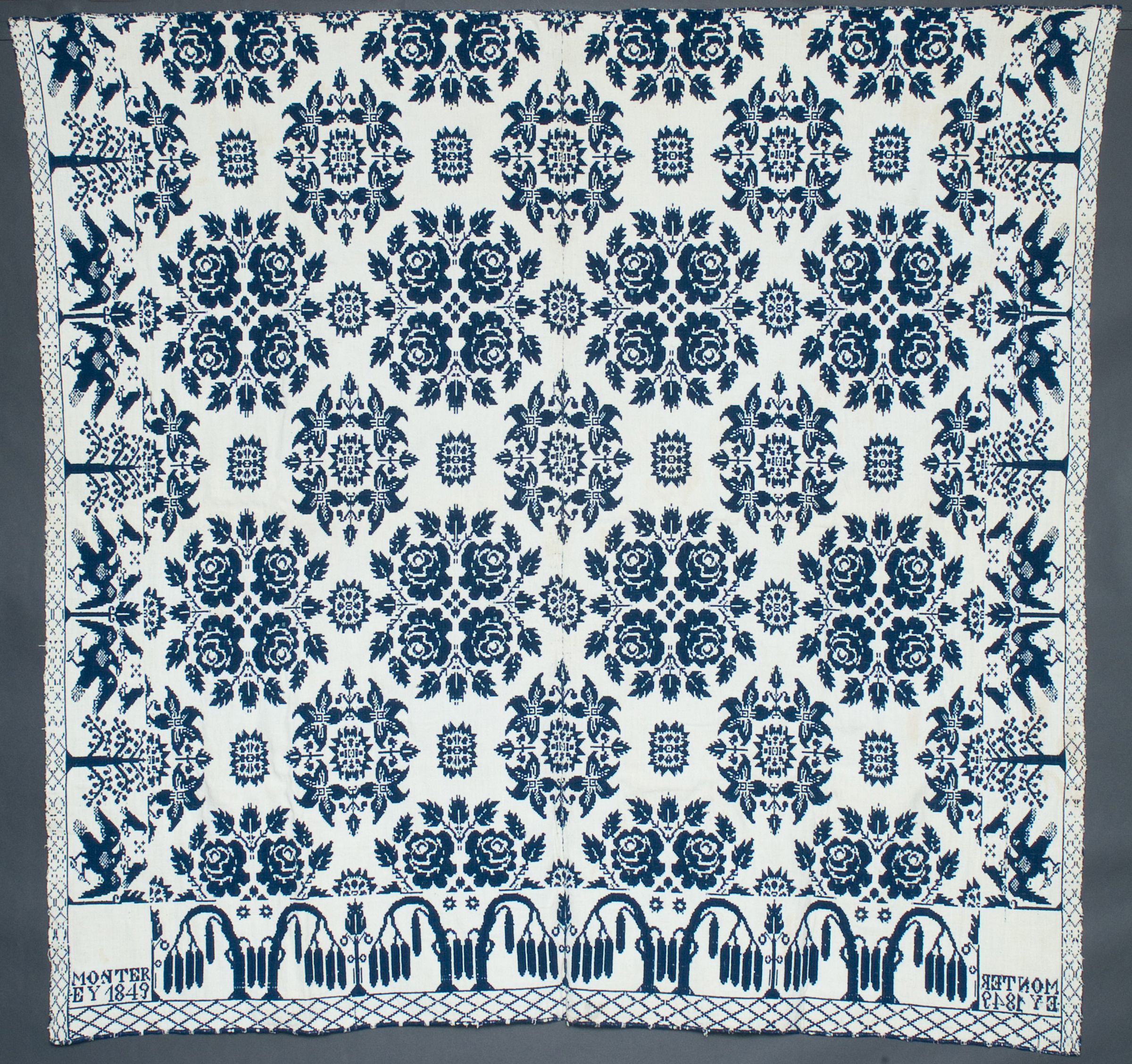 blue and natural; double weave; two loom widths joined; central rose motif; bird and tree border on left and right; tree border on bottomCollection