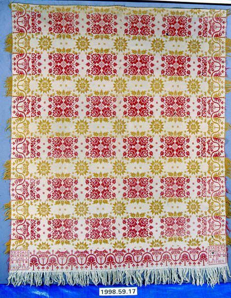 Figured coverlet; undyed and blue cotton and rose and gold wool, tied double cloth (Beiderwand). Center seam joins two panels. Top edge hemmed, sides and bottom fringed. The central motif is composed of four roses which form a square and are flanked by leaves. The roses are separated from one another by stripes (both horizontal and vertical) and at each intersection there is a starburst motif. Border on three sides contains trees. A palm tree is placed on the upper side of a wavy line while a tree with three large leaves is below the wavy line.Collection