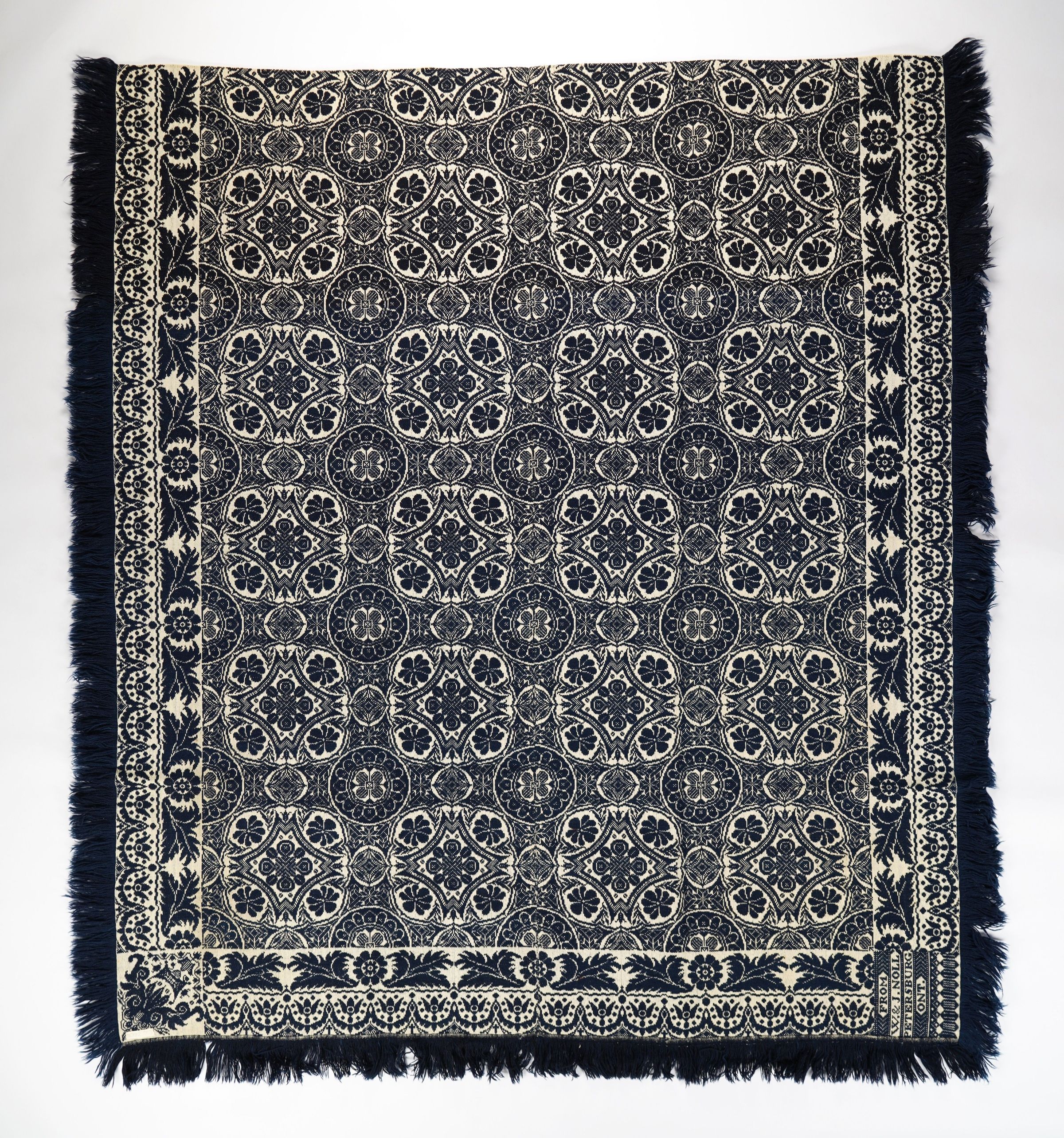 Figured coverlet; undyed cotton and blue wool, tied double cloth (Beiderwand). Center seam joins two panels. Hemmed top and bottom, fringed sides and bottom (bottom fringe is sewn on). Central motif consists of square floral medallions composed of diamond and four circular flowers at each corner. Inside the diamond is a floral motif. Separating the squares are horizontal and vertical bands filled with floral motifs. At each intersection there is a circular motif. Two borders are along three sides and flank the corner blocks. The inner border is a repeated floral motif with scrolling leaves on either side. The outer border contains a tulip and swag design. One corner block contain the woven text; the other has a floral motif.Collection