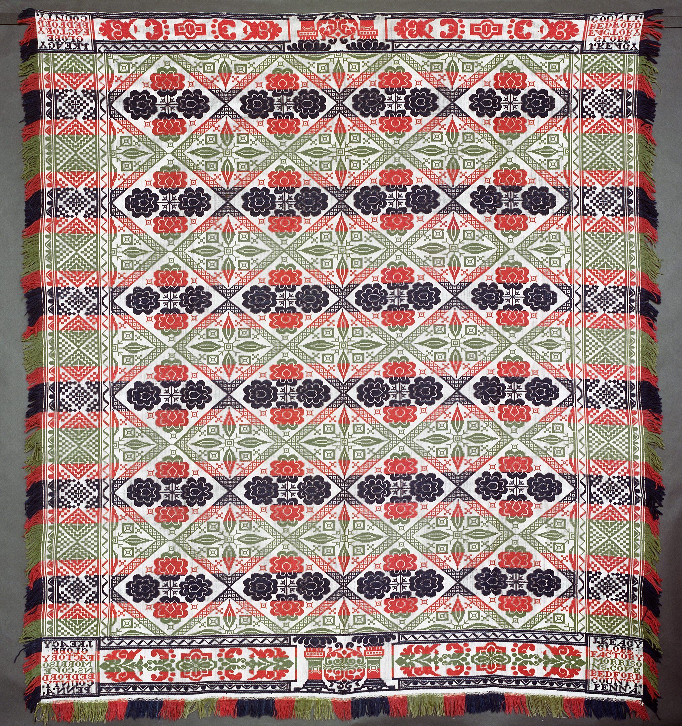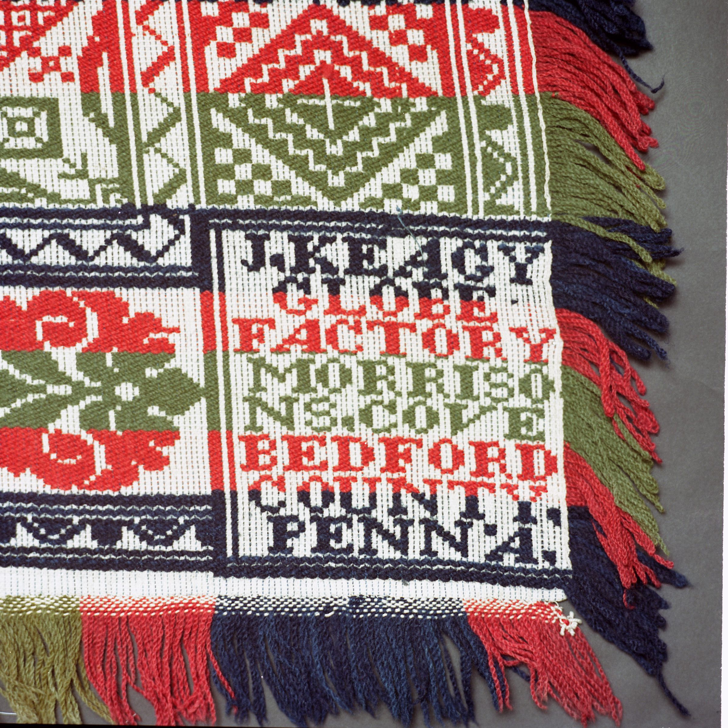 Beiderwand; navy, red, green, natural; seamless; fringe on 3 sides; 4 corner blocks; side borders of a diamond pattern, top and bottom borders contain what look to be flowers and pillars; centerfield of floral clusters on a diamond pattern gridCollection