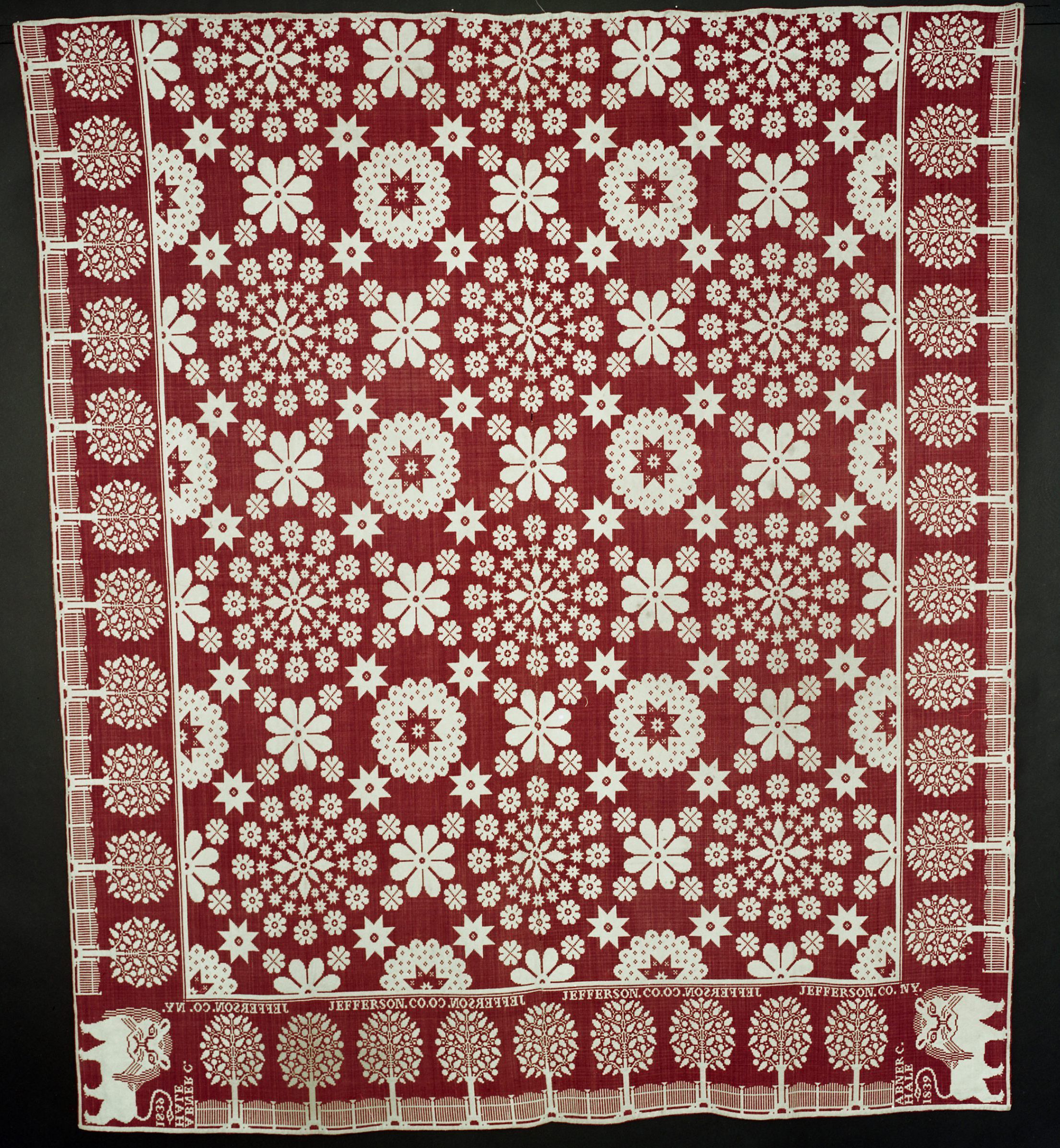Double weave; mauve, natural; two loom widths joined; no fringe; border on 3 sides of trees and fences; two corner blocks with large lion and inscription; centerfield of flowers and stars that form a diamond patternCollection