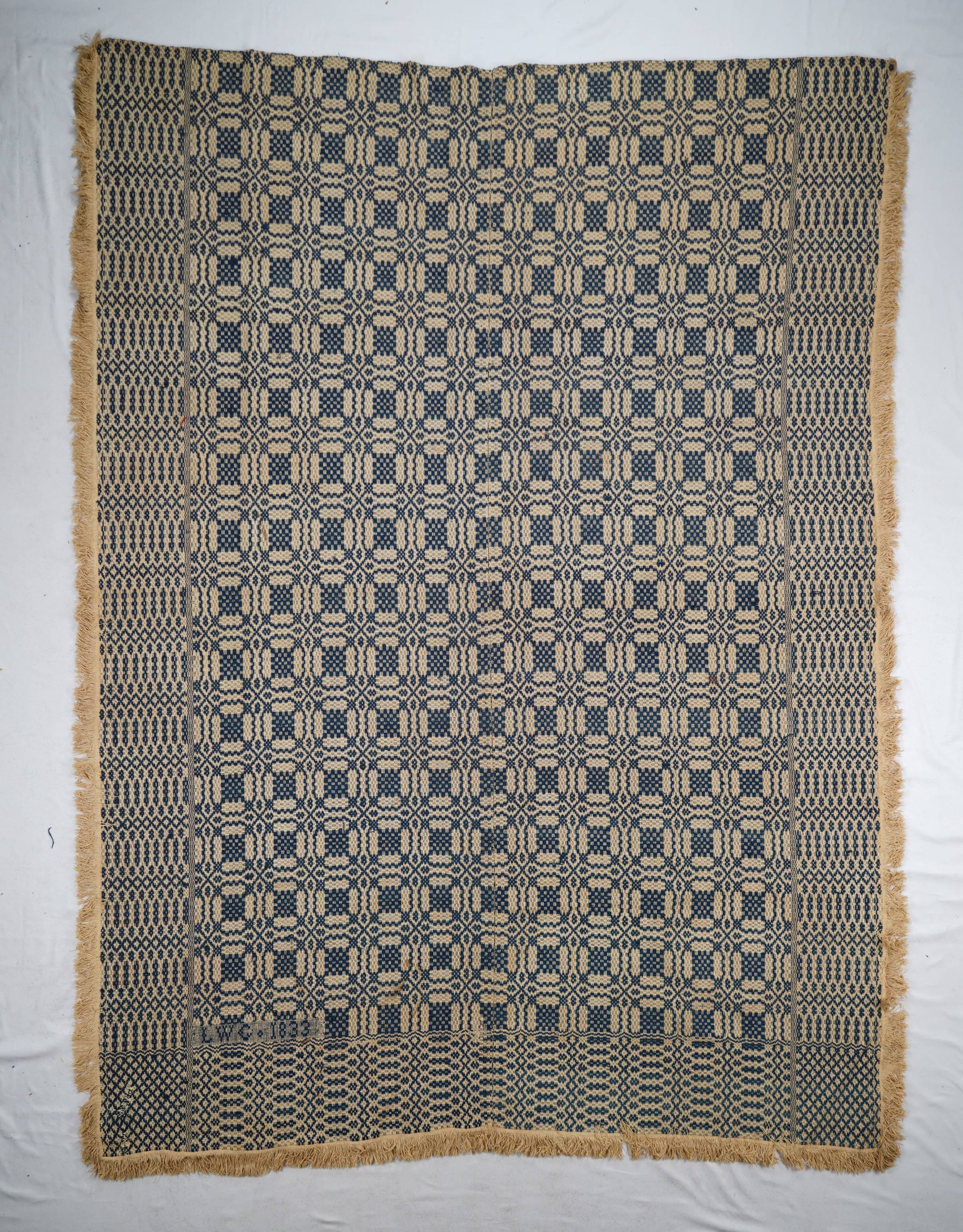 Natural and navy geometric overshot coverlet; two panels joined by a center seam. Border and fringe on three sides.Collection