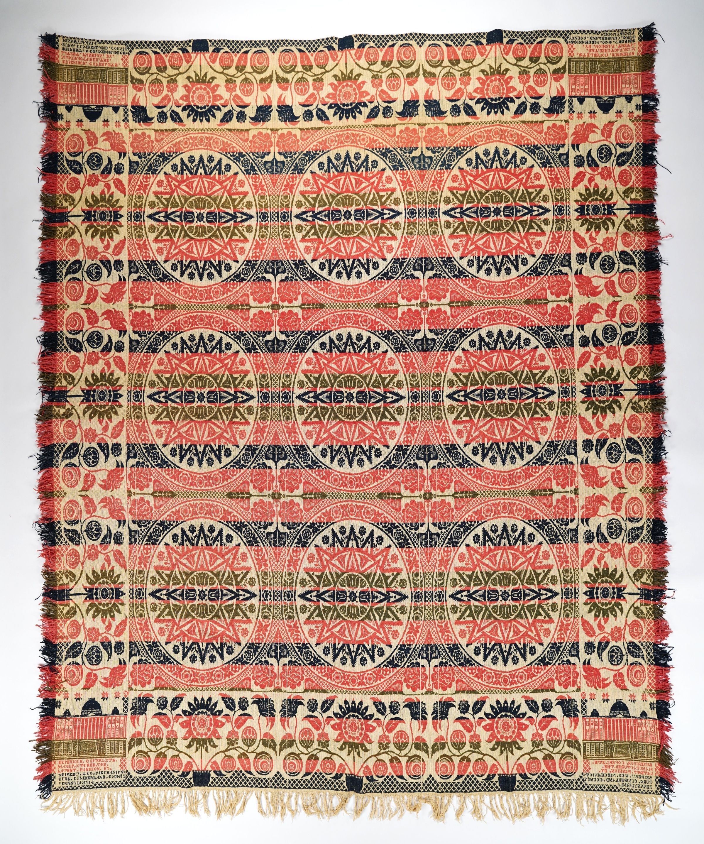 Figured coverlet; undyed and blue cotton and rose, blue, and olive wool, tied double cloth (Beiderwand). Top edge is hemmed, sides and bottom are fringed. Central motif consists of medallions in an elliptical starburst design. At the center of each starburst is a tulip motif with rose/tulip design framing the starbursts. Separating the rows of starbursts are diamond shaped medallions of four roses with a spade shaped leaf pointing in all four directions. Each side has a border containing three sunflower-like flowers in a pot with leaves and stylized flowers branching to either side of the pot. In each corner block there is a domed building and woven text.Collection