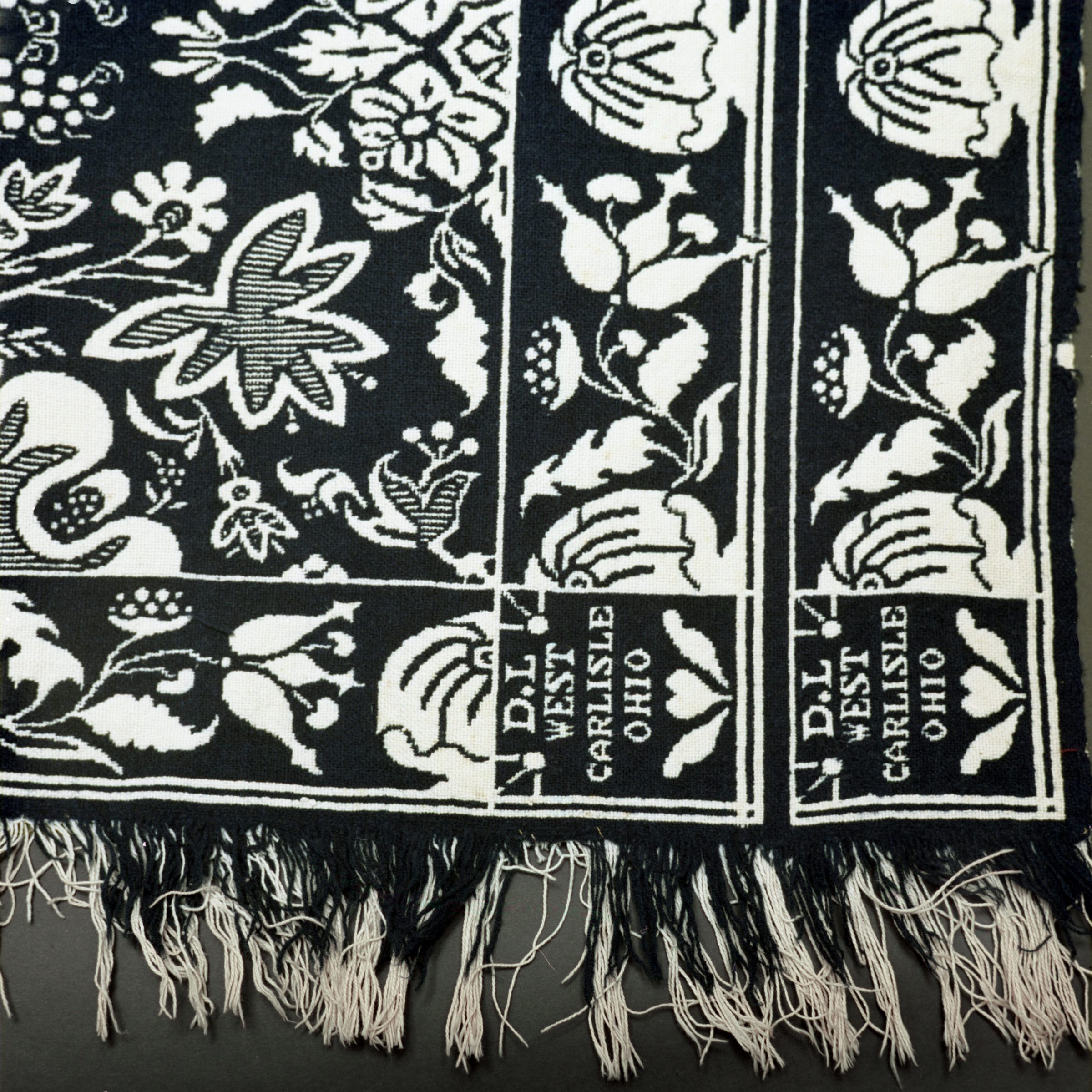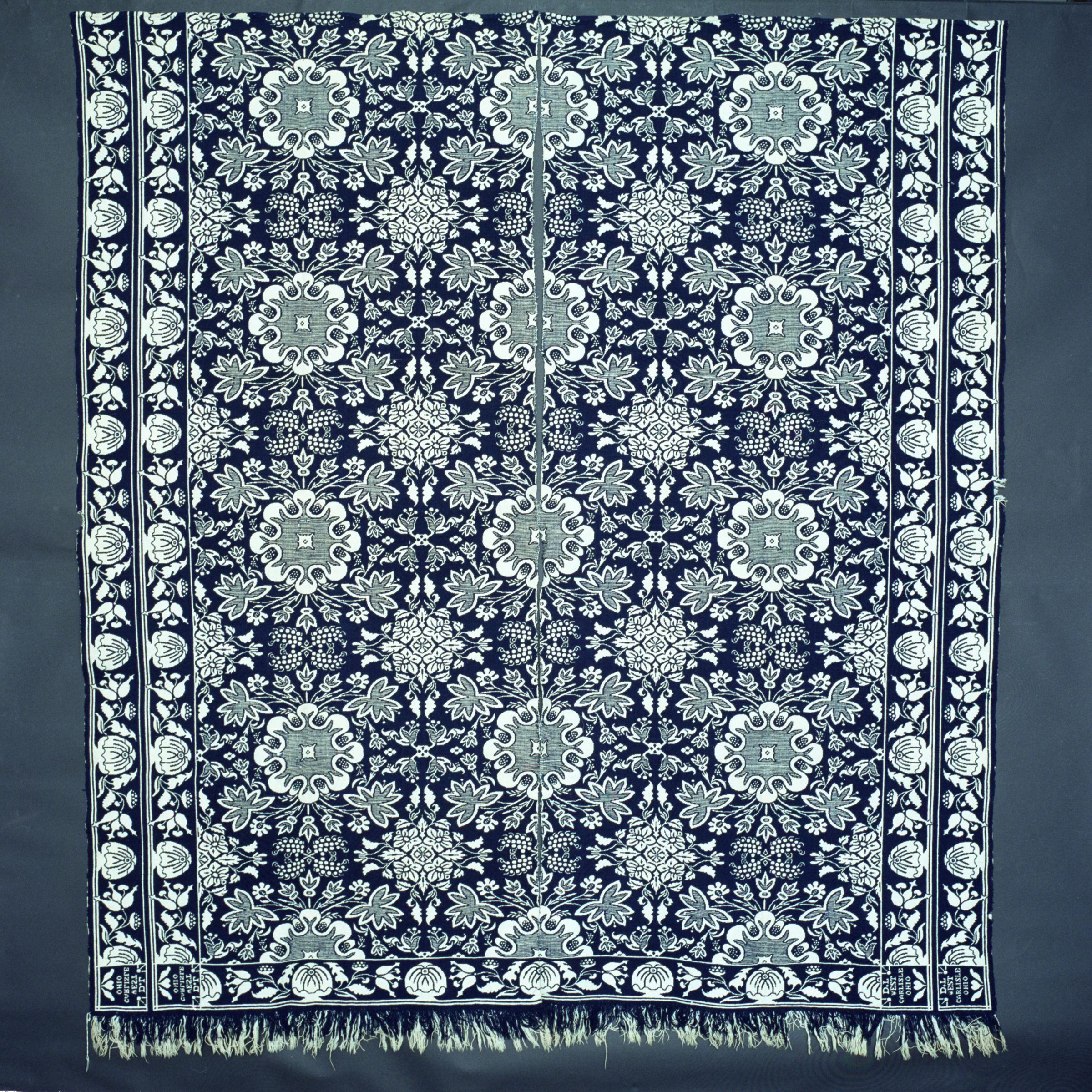 Double weave; navy, natural; two loom widths NOT joined; fringe one end; one corner block; double border on outer long edge; leaf/floral pattern throughoutCollection