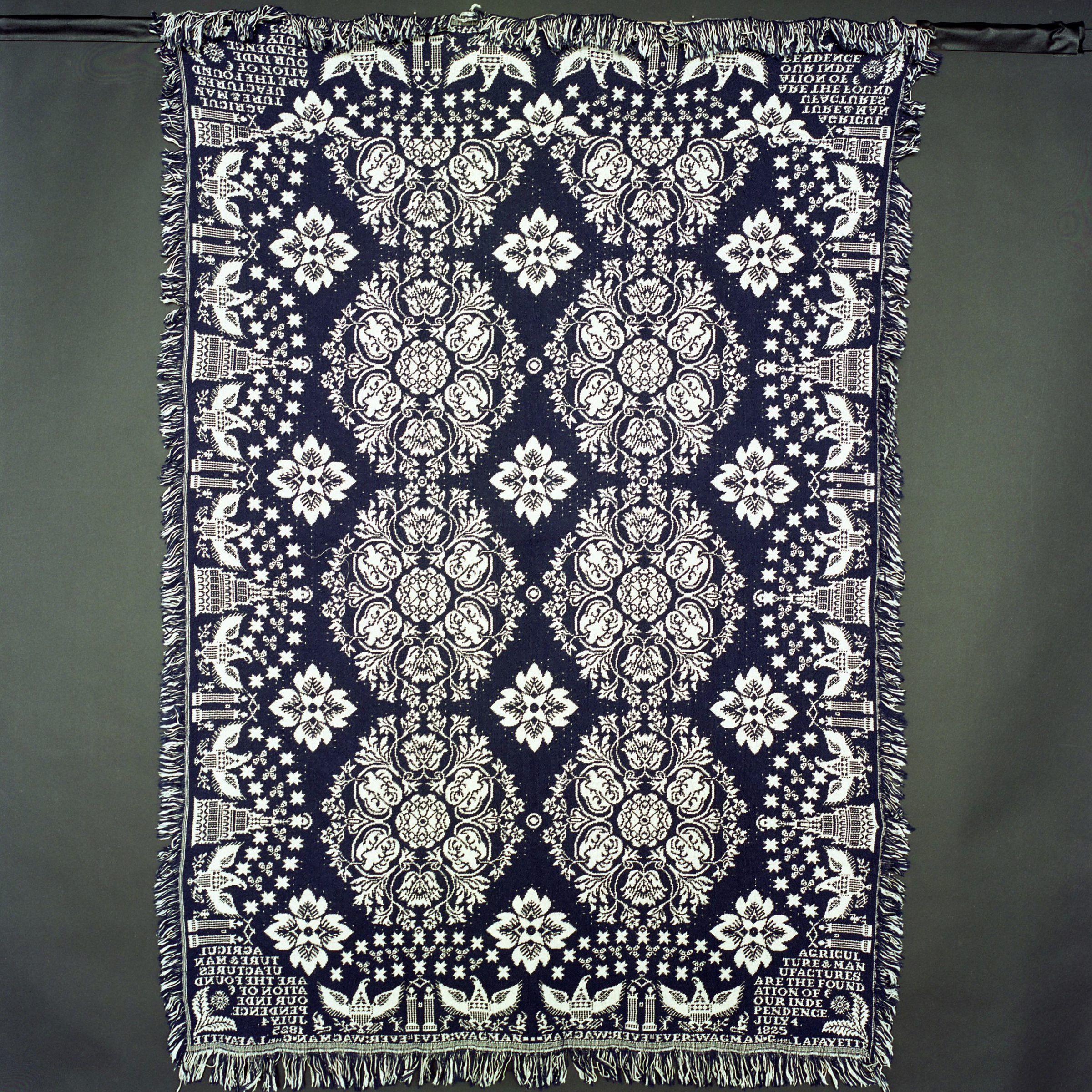 Double weave; navy, white; seamless; fringe on 4 sides; 4 corner blocks with inscription and leaves; border of eagles, stars, and government buildings or domes; centerfield contains six small floral medallions with flowers in between; appears to be a reproduction because it is unusually small, soft, and loosely wovenCollection