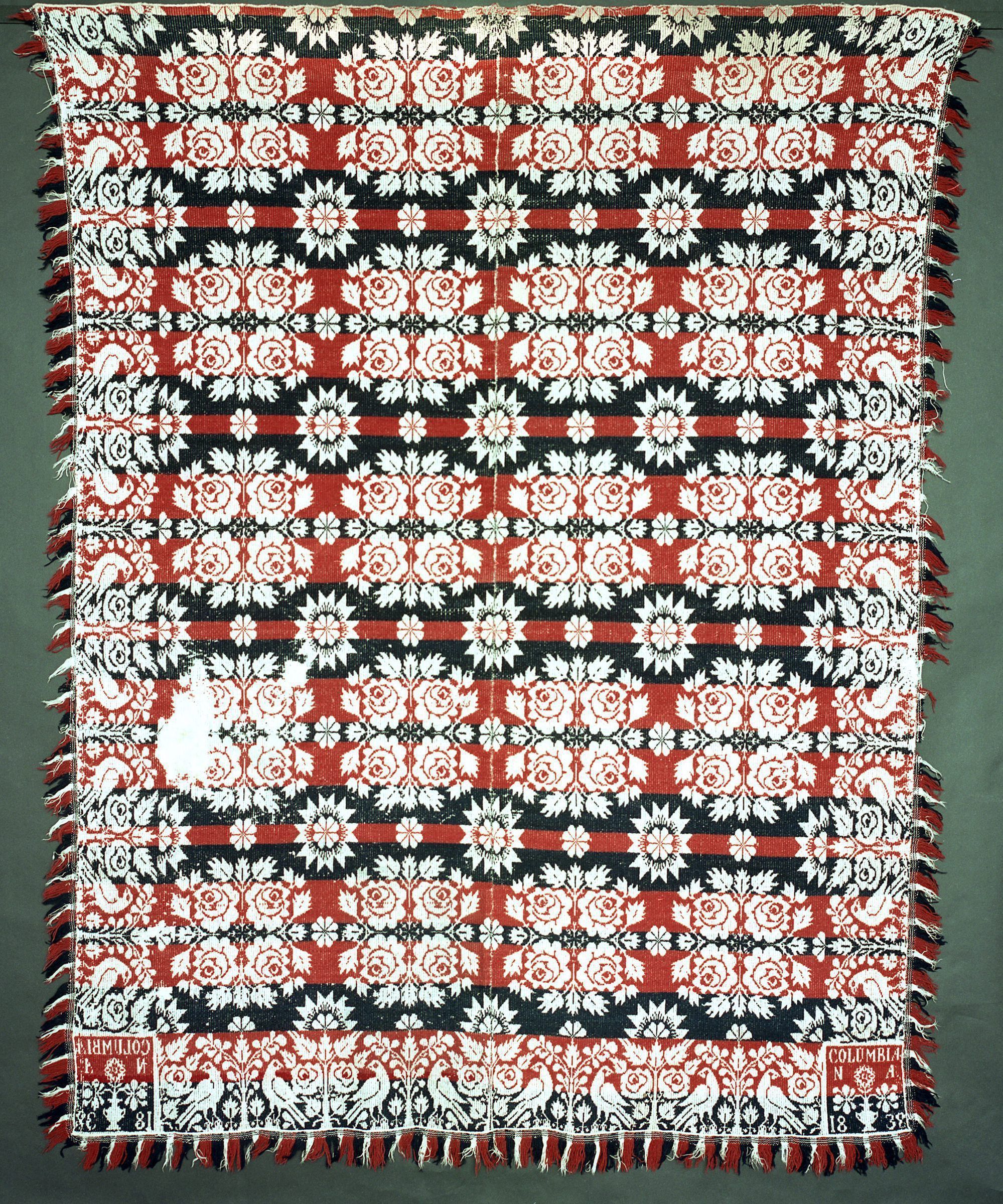 red, navy, natural; two loom widths joined; fringe on 3 sides; center rosette clusters and flowers inside stars; border on 3 sides distel fink and birgds and trees and rosettesCollection