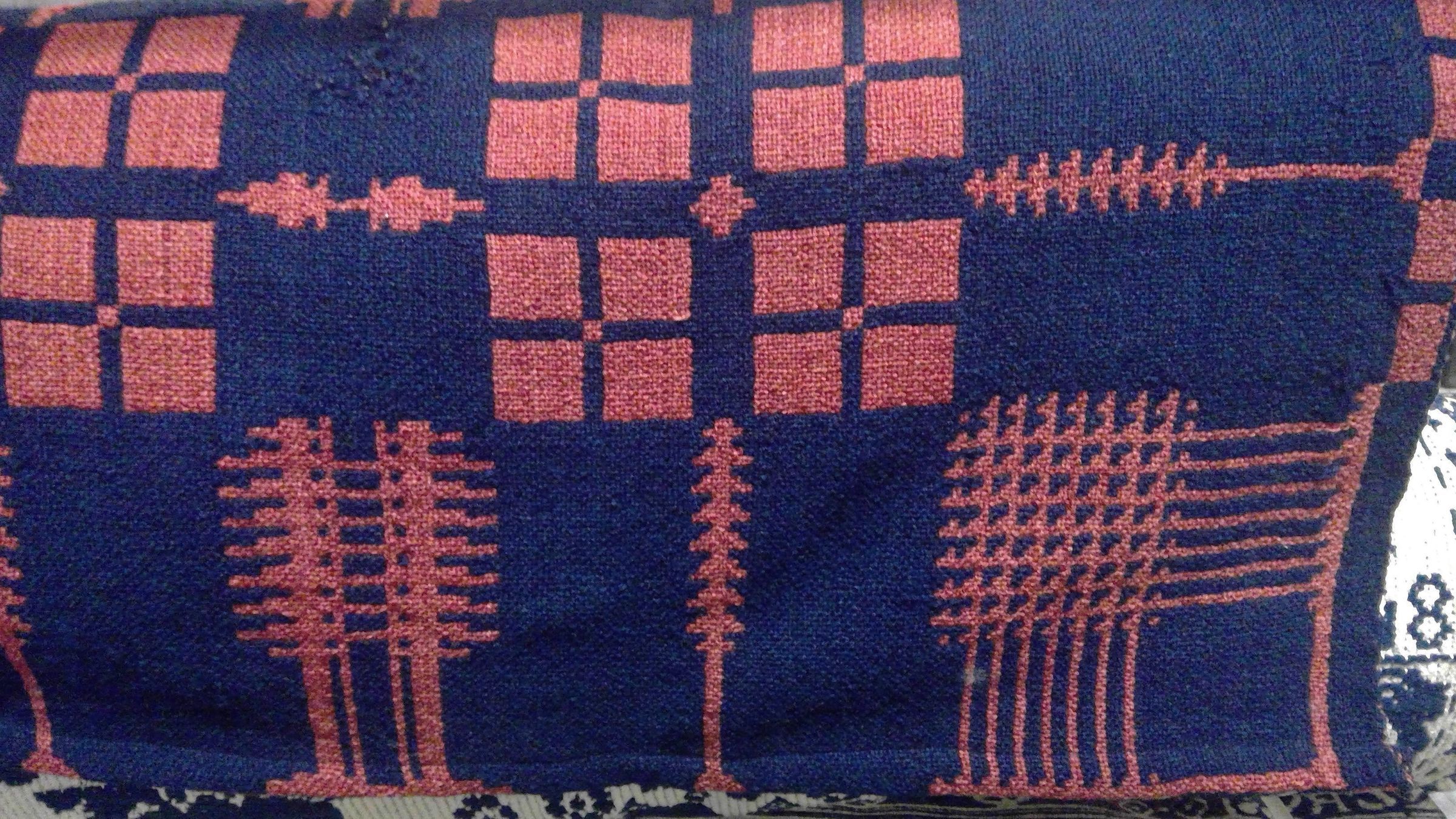 Double weave; navy, orange; possibly all wool; no fringe; no corner blocks; geometric trees on 3 sides; square geometric pattern in middle; 2 loom widths joinedCollection