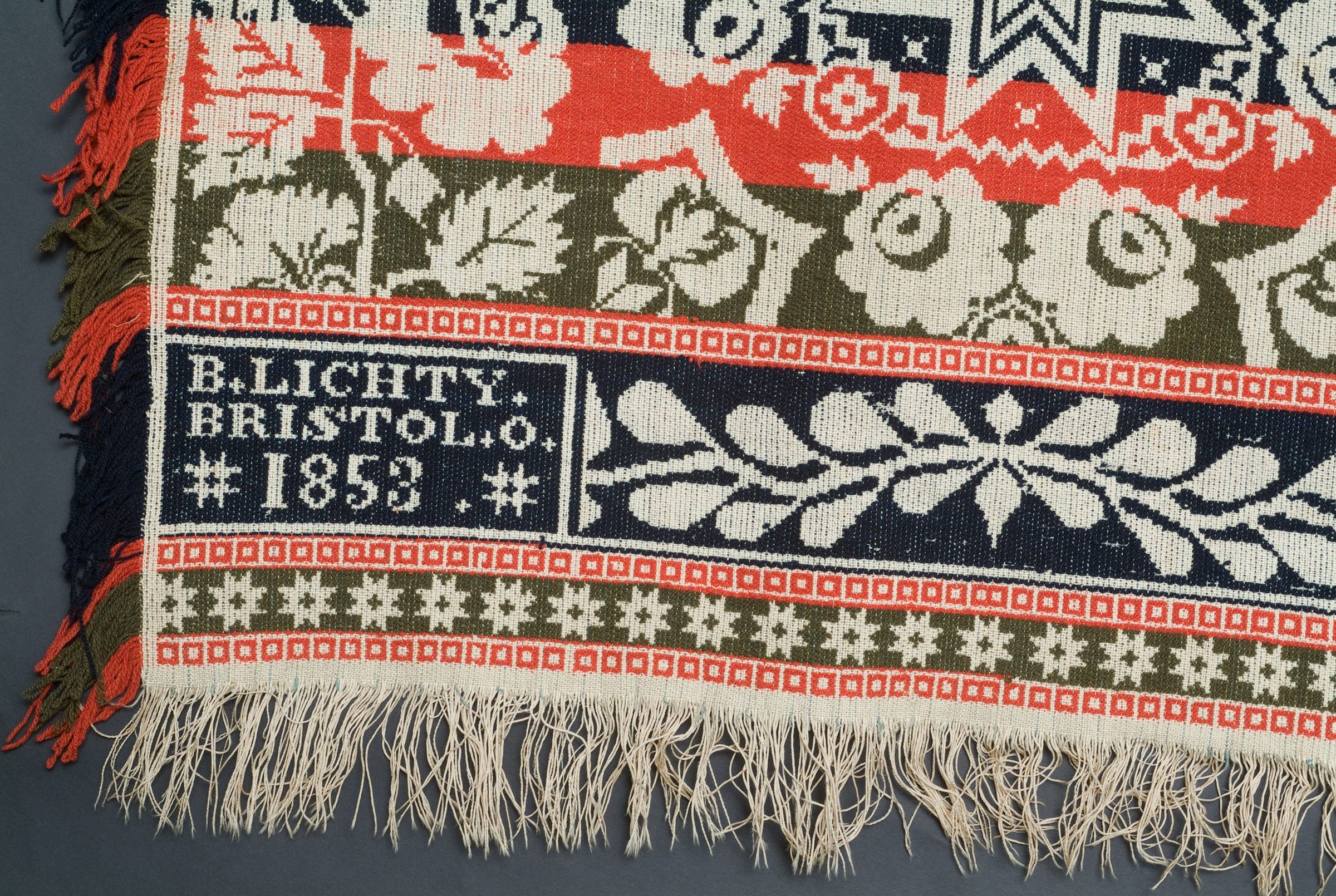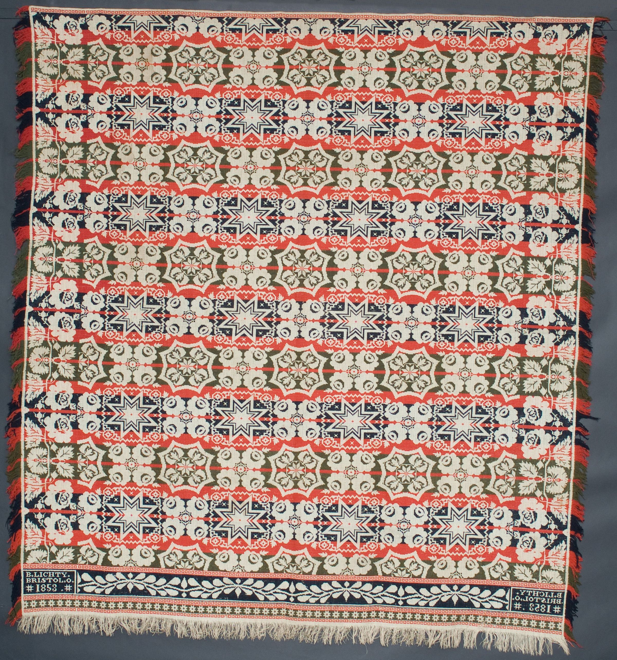Beiderwand; navy, red, green, natural; seamless; fringe on 3 sides; 2 corner blocks; flowers and stars alternating throughout; double bottom border, one row of small stars and one row of vineCollection