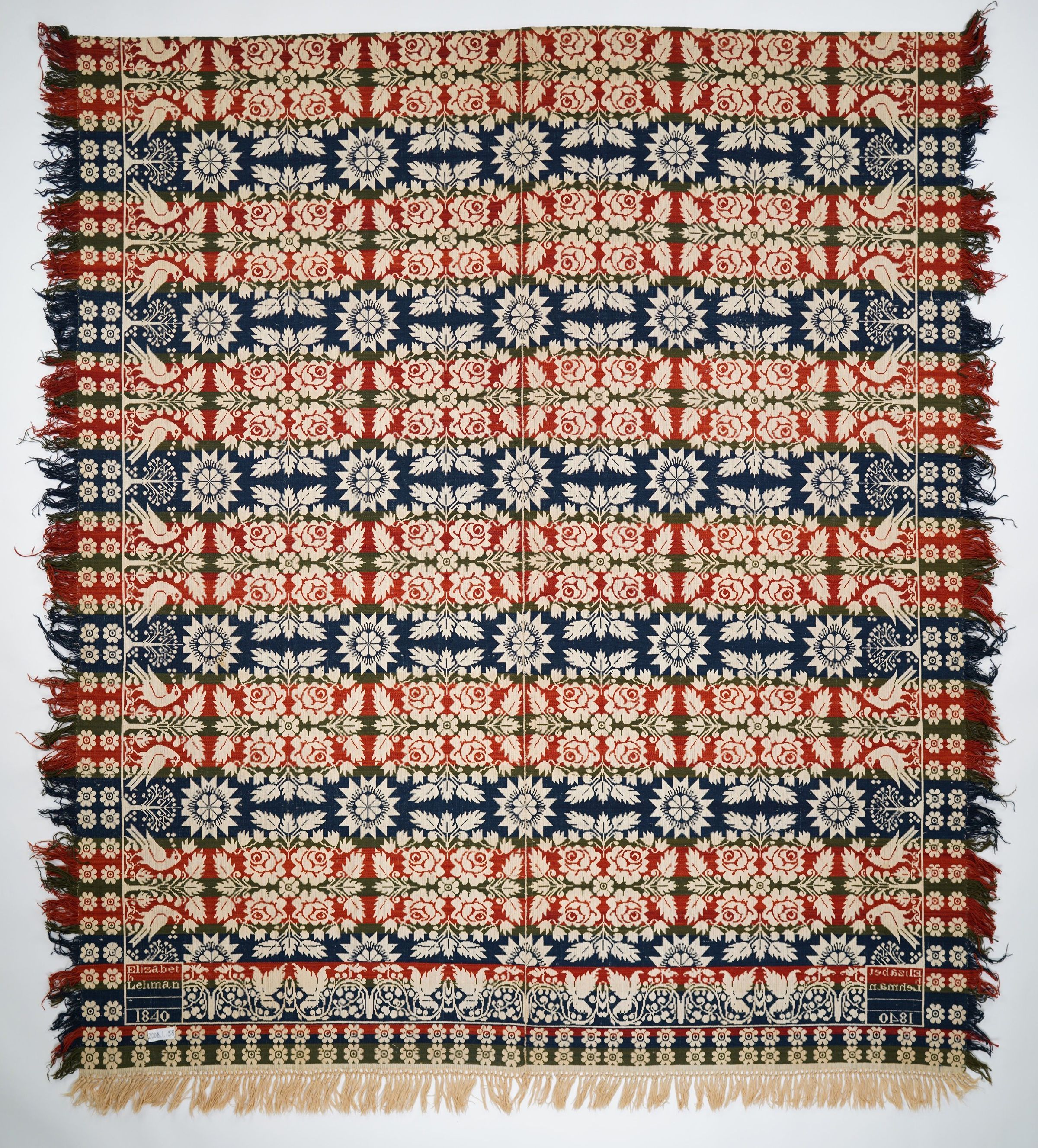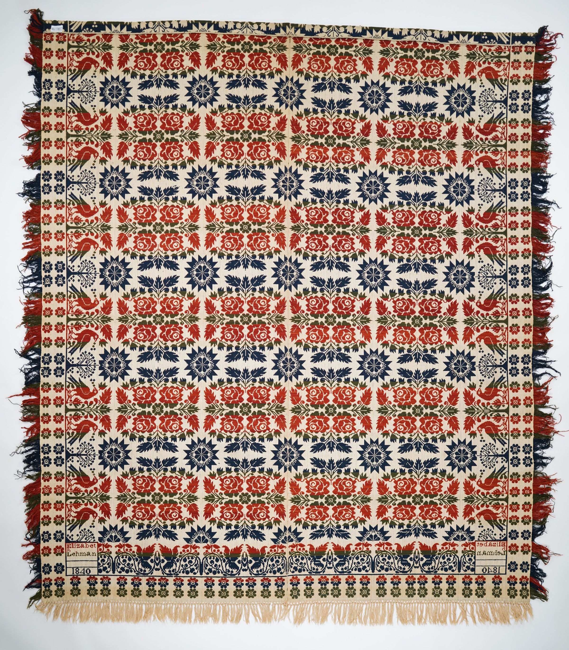 Beiderwand; navy, red, green, natural; self-fringe on 3 sides; 2 loom widths joined; top edge sewn onto itself; double border, outer border of small flowers, inner border of birds and trees; center is floralCollection
