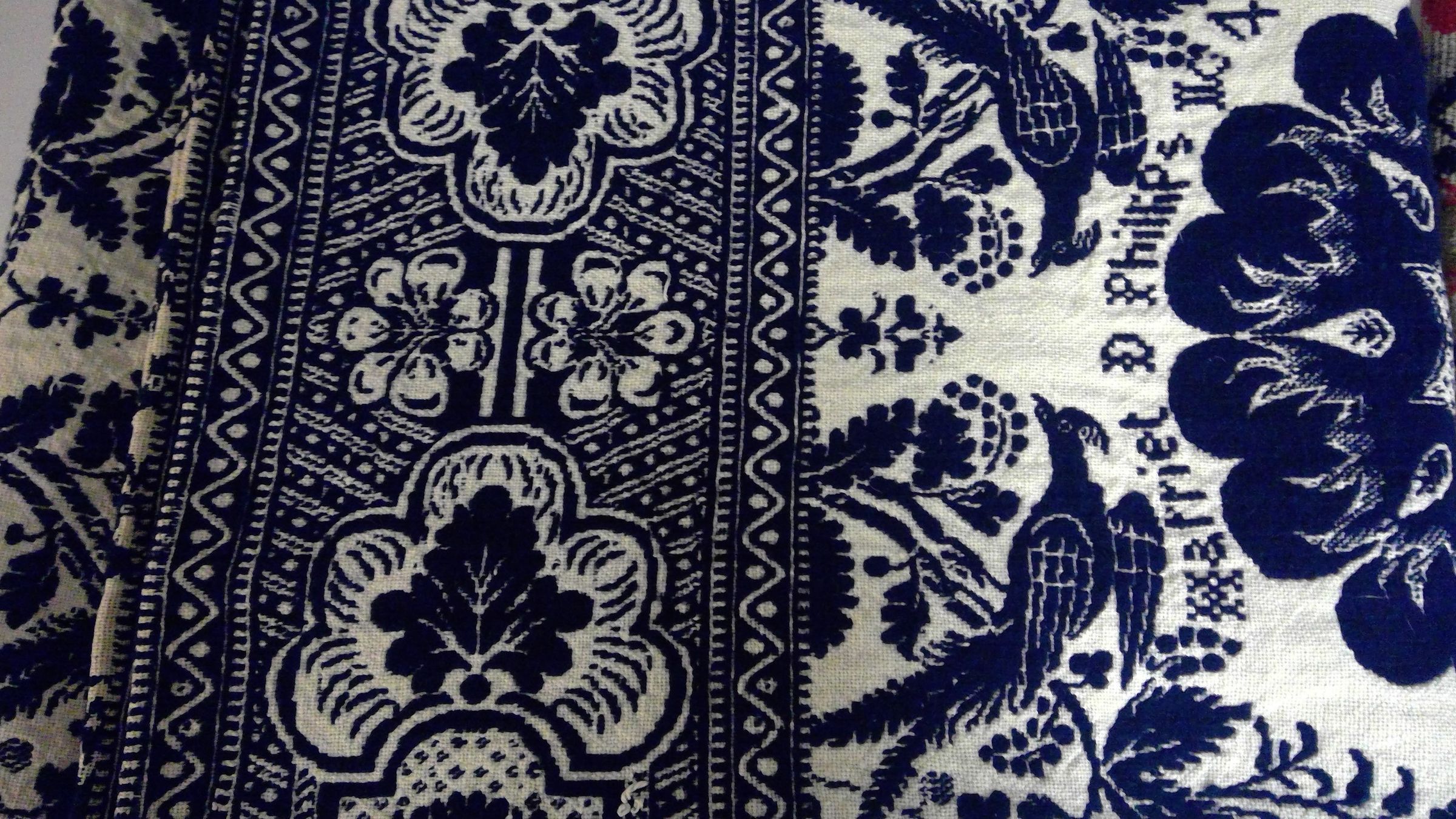 Double weave; navy, natural; no fringe; seamless; no inscription; simgle border of flowers and stripes; 4 square corner blocks with flowers in them; centerfield has flowers and birdsCollection