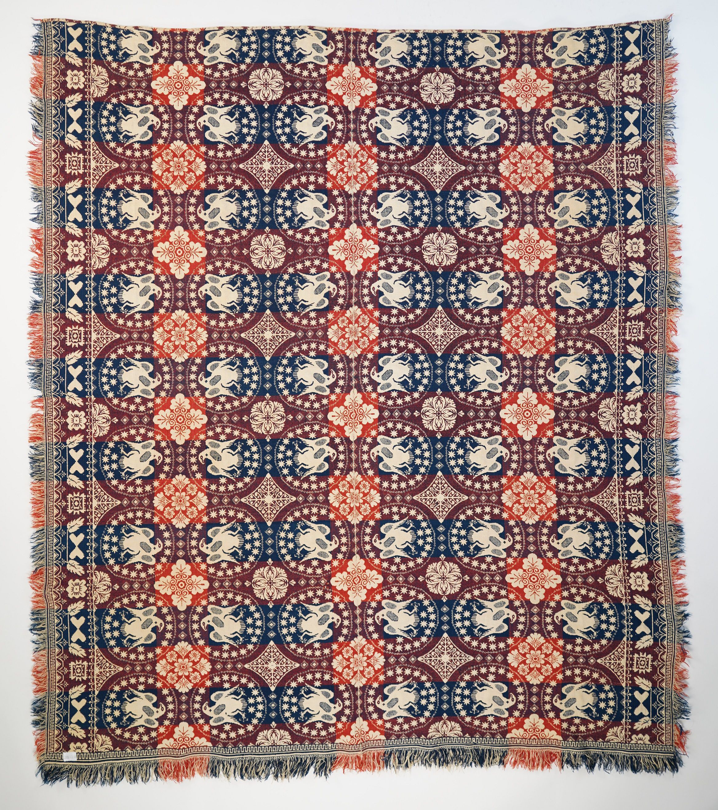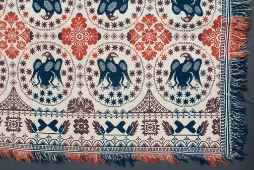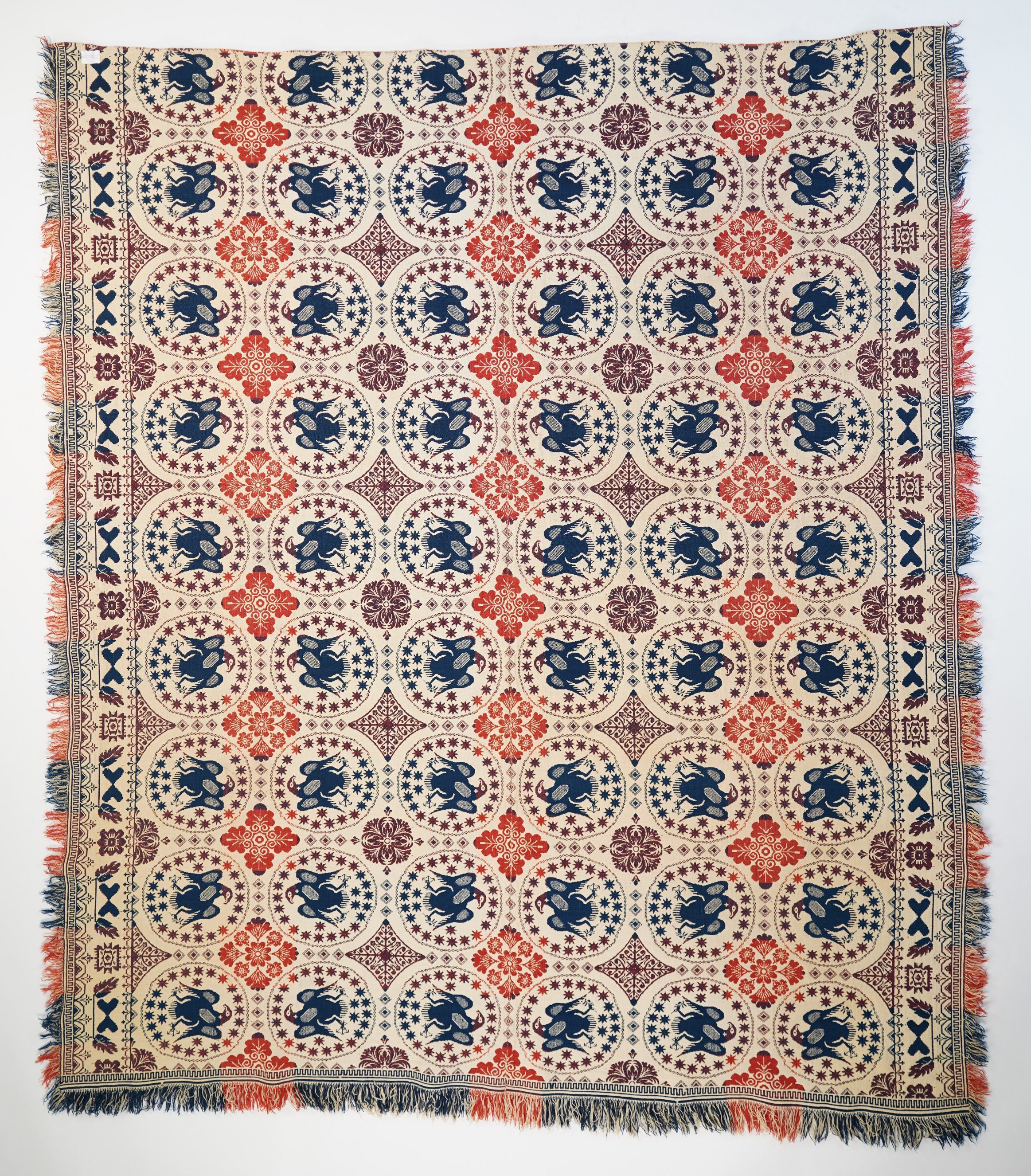 Double weave; blue, orange, purple, natural; fringe on 3 sides; no corner blocks; side borders of leaves; centerfield of eagles in circles and stars; interspersed with floral designsCollection