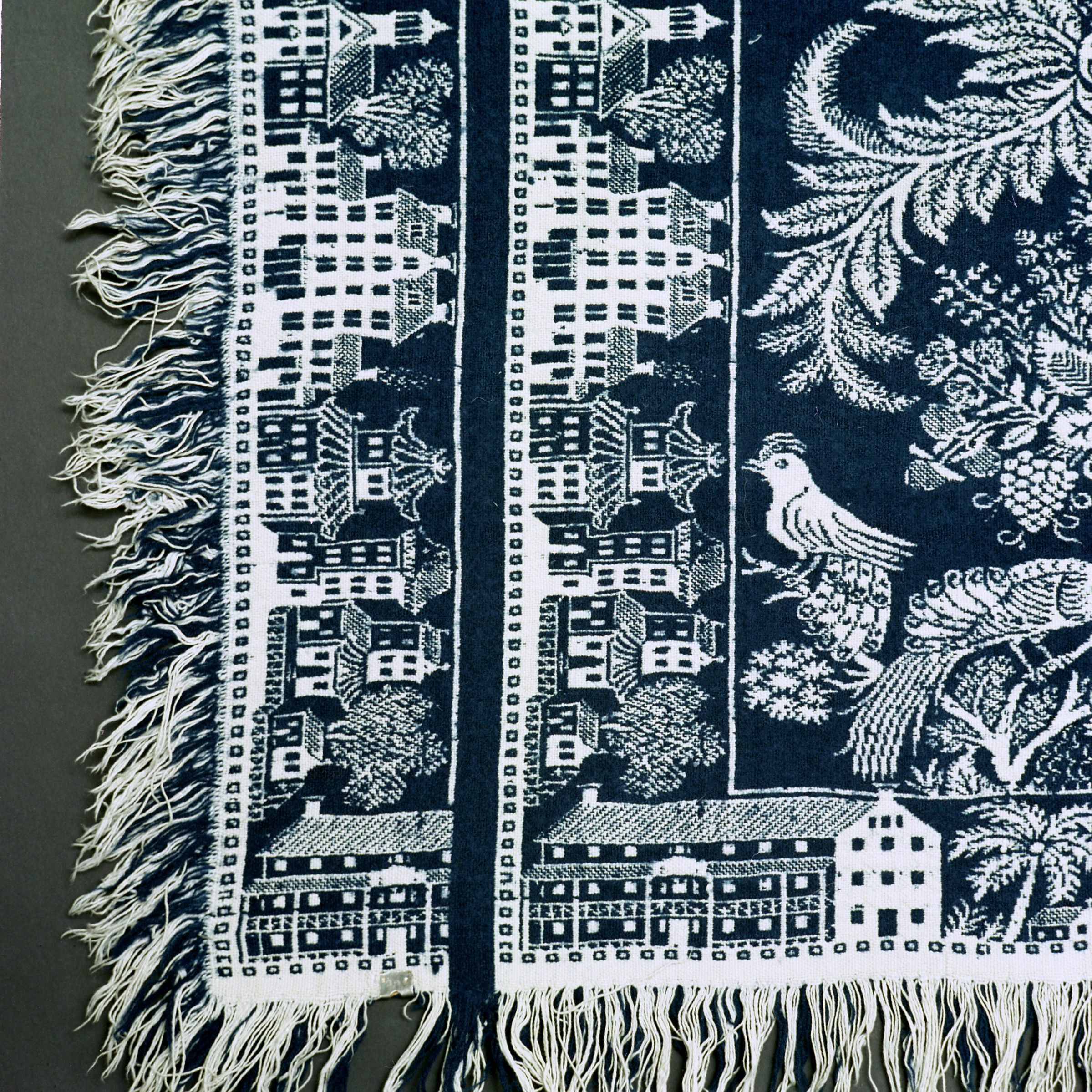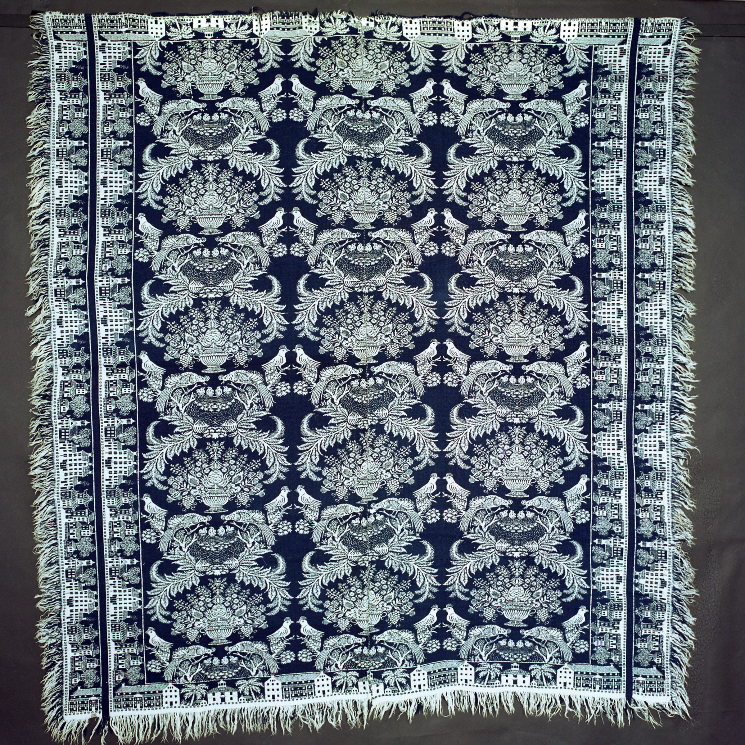 Double weave; navy, natural; fringe on 3 sides; two loom widths joined; border of houses, trees, churches, lighthouses, oriental townhouses (Boston Town border), mansions; centerfield has peacocks, ferns, leaves, berries, grapes, potted plantsCollection