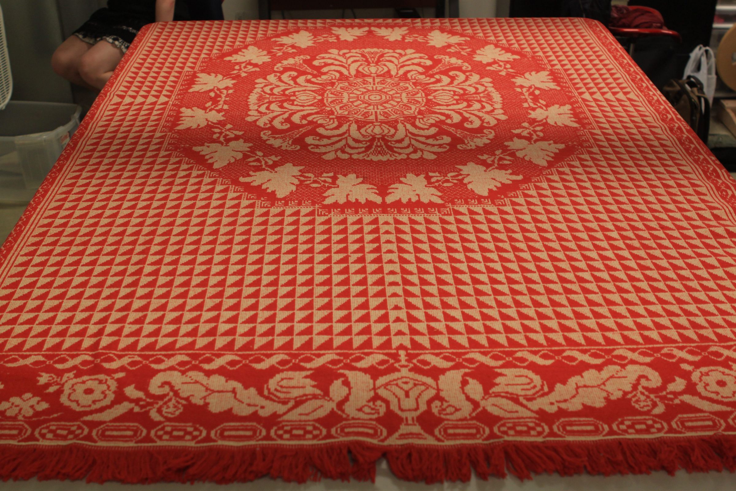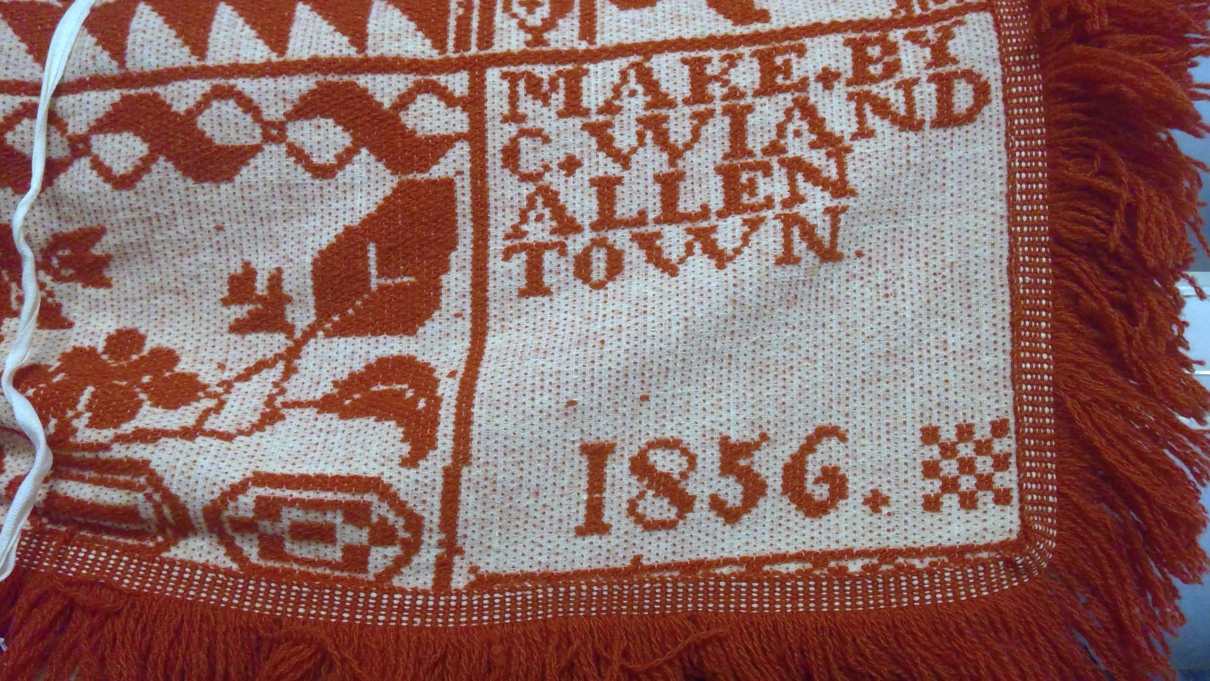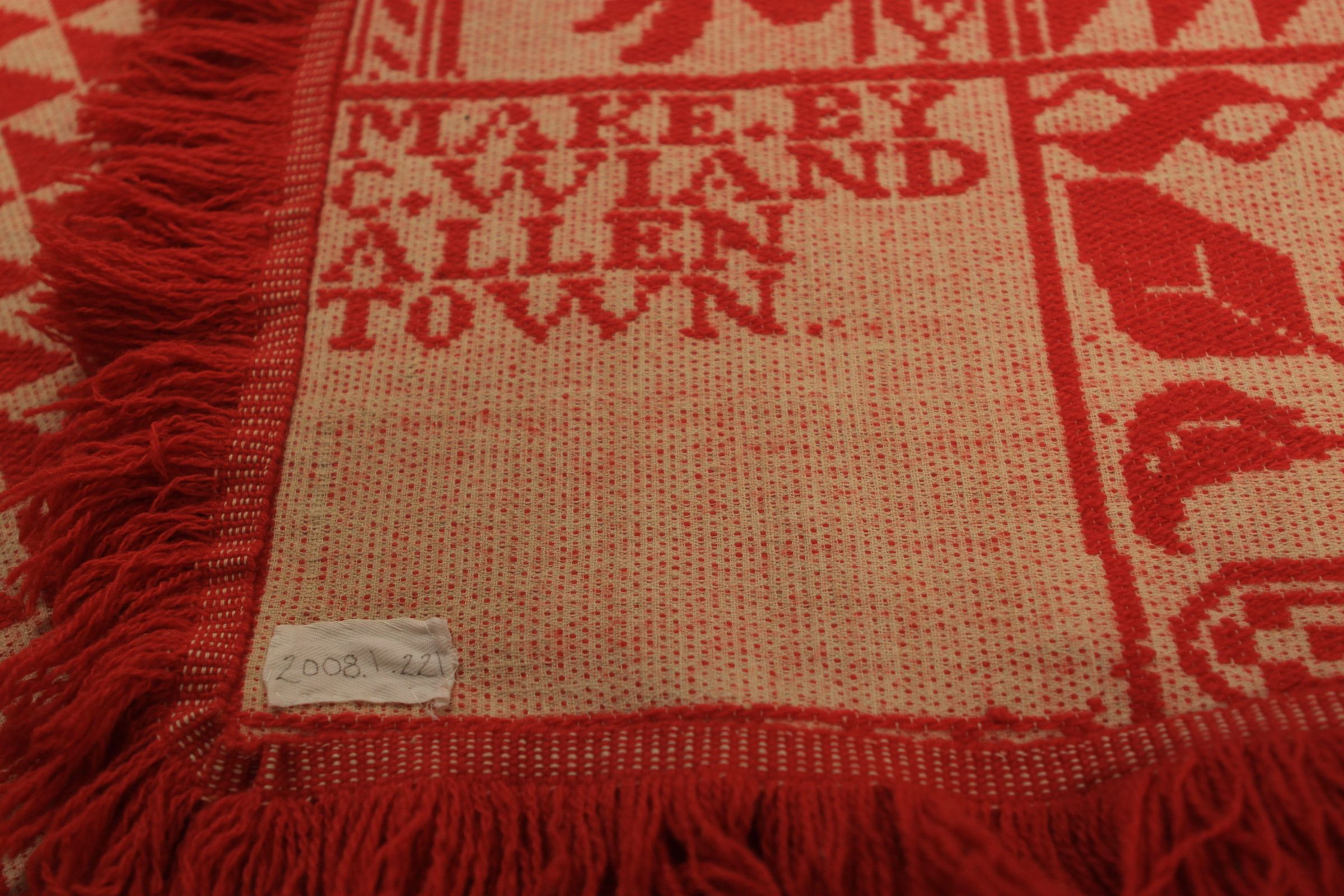 Beiderwand; red, natural; fringe on 3 sides; center medallion of shape surrounded by flowers and leaves; rest of centerfield is small red and white triangles; border of grapevine and trophy-like shapes; 2 corner blocks with inscriptionCollection
