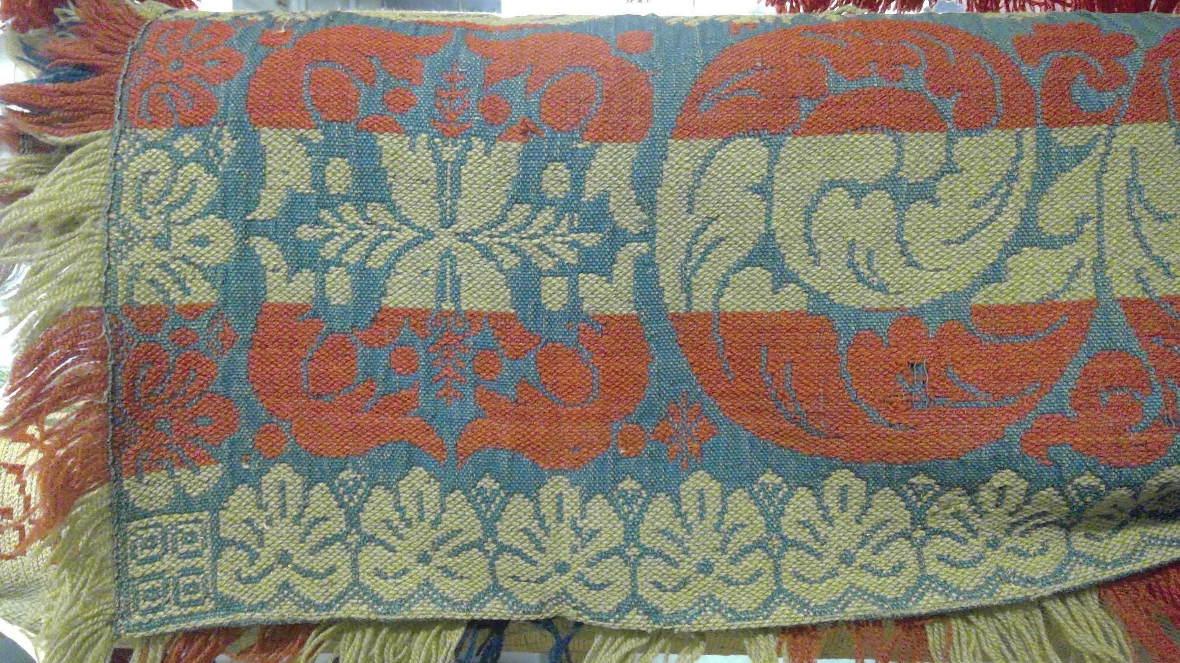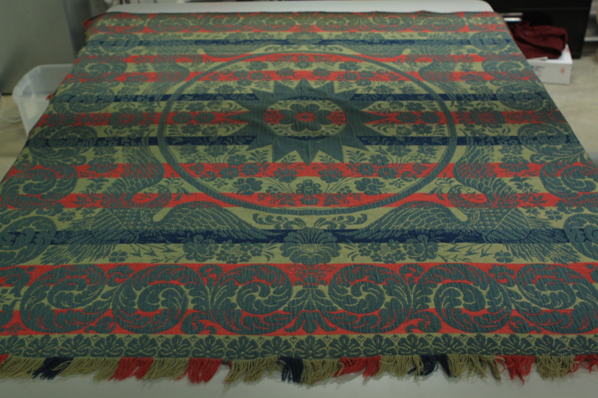 Beiderwand; blue, green, olive, red; seamless; fringe on 3 sides; no corner blocks; center medallion of star and flowers surrounded by four large eaglesCollection