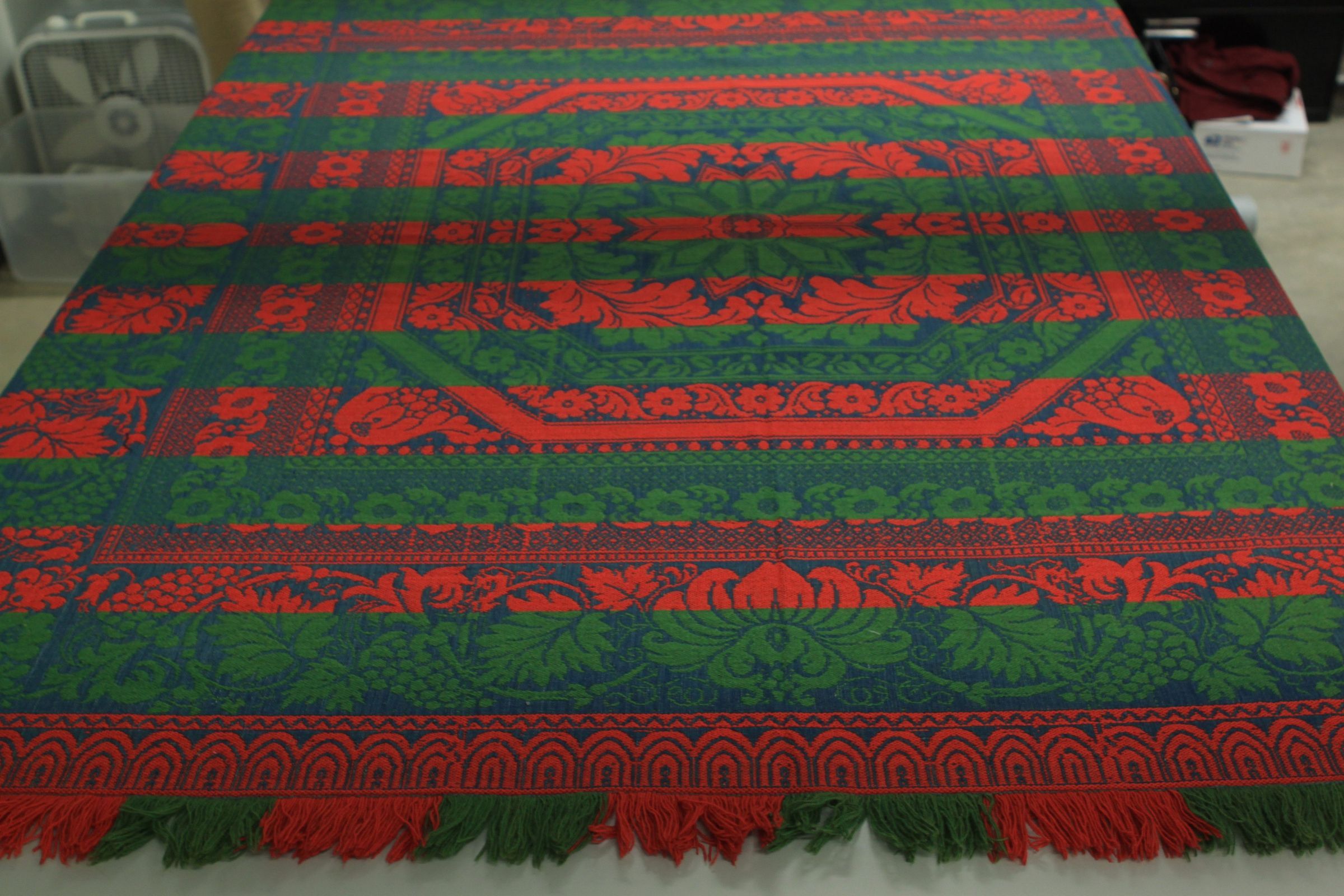 Beiderwand; red, green, blue; seamless; fringe on 3 sides; no corner blocks; floral center medallion surrounded by several borders, outermost large border contains leaves and grapesCollection