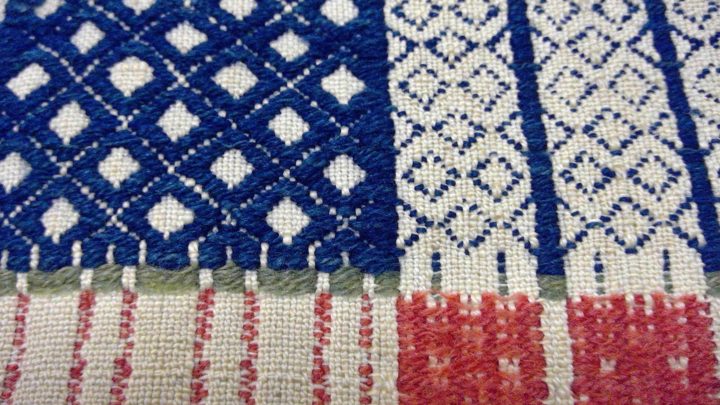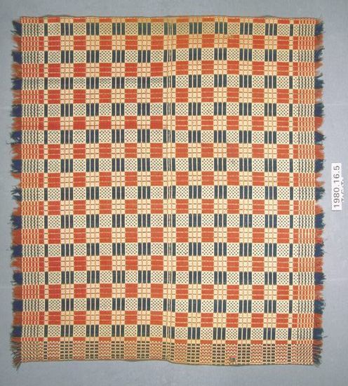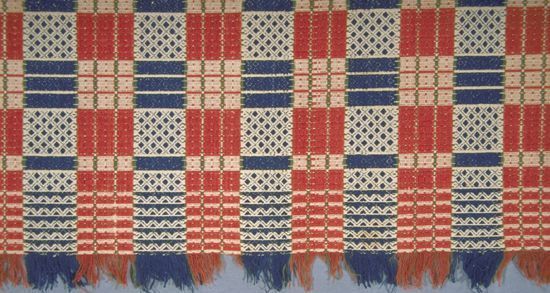 Geometric coverlet twill with self fringe on two sides.Two panels joined by a center seam. Navy and green wool with undyed cotton. Central motif is red and blue checked with squares of stripes and diamonds. Unknown weaver.Collection
