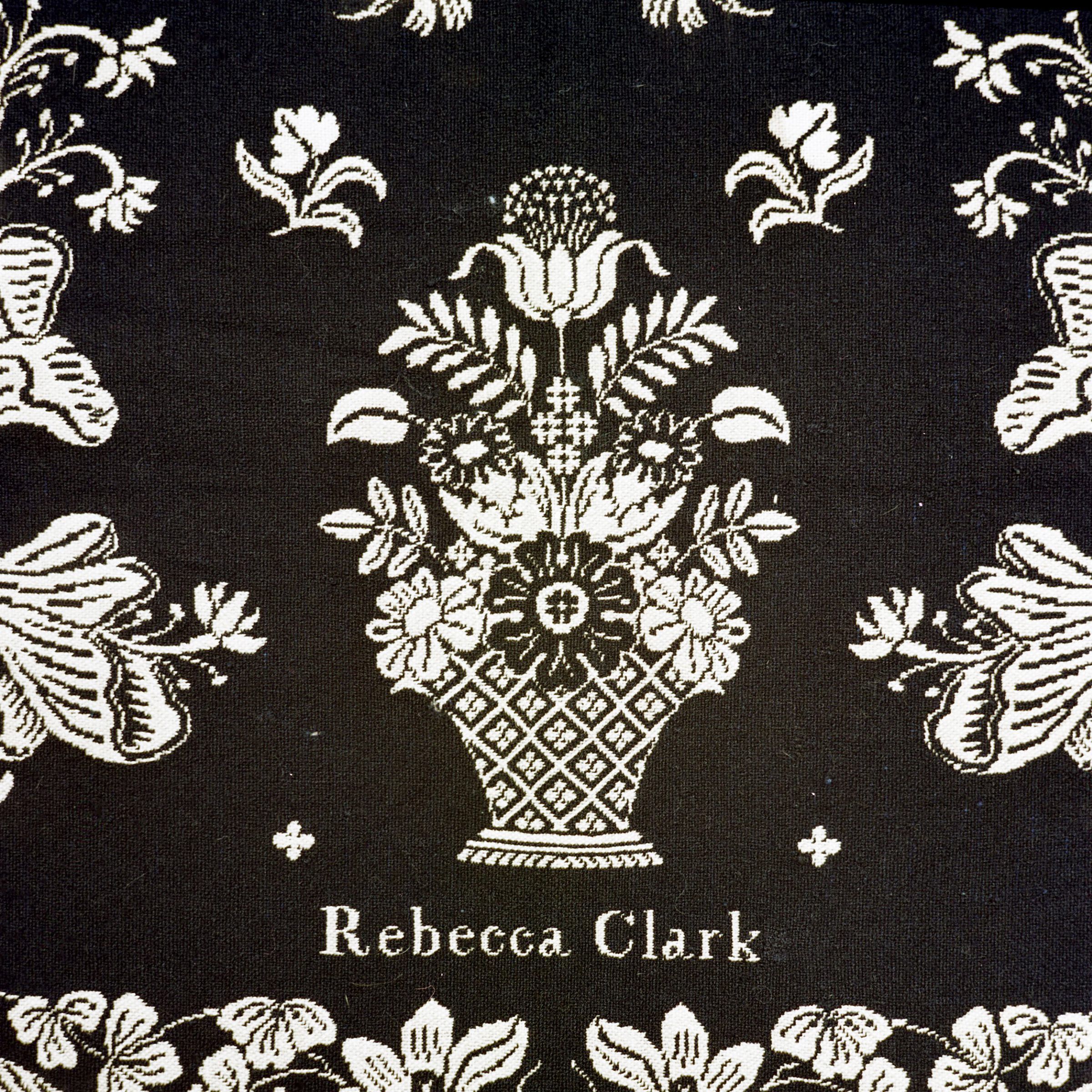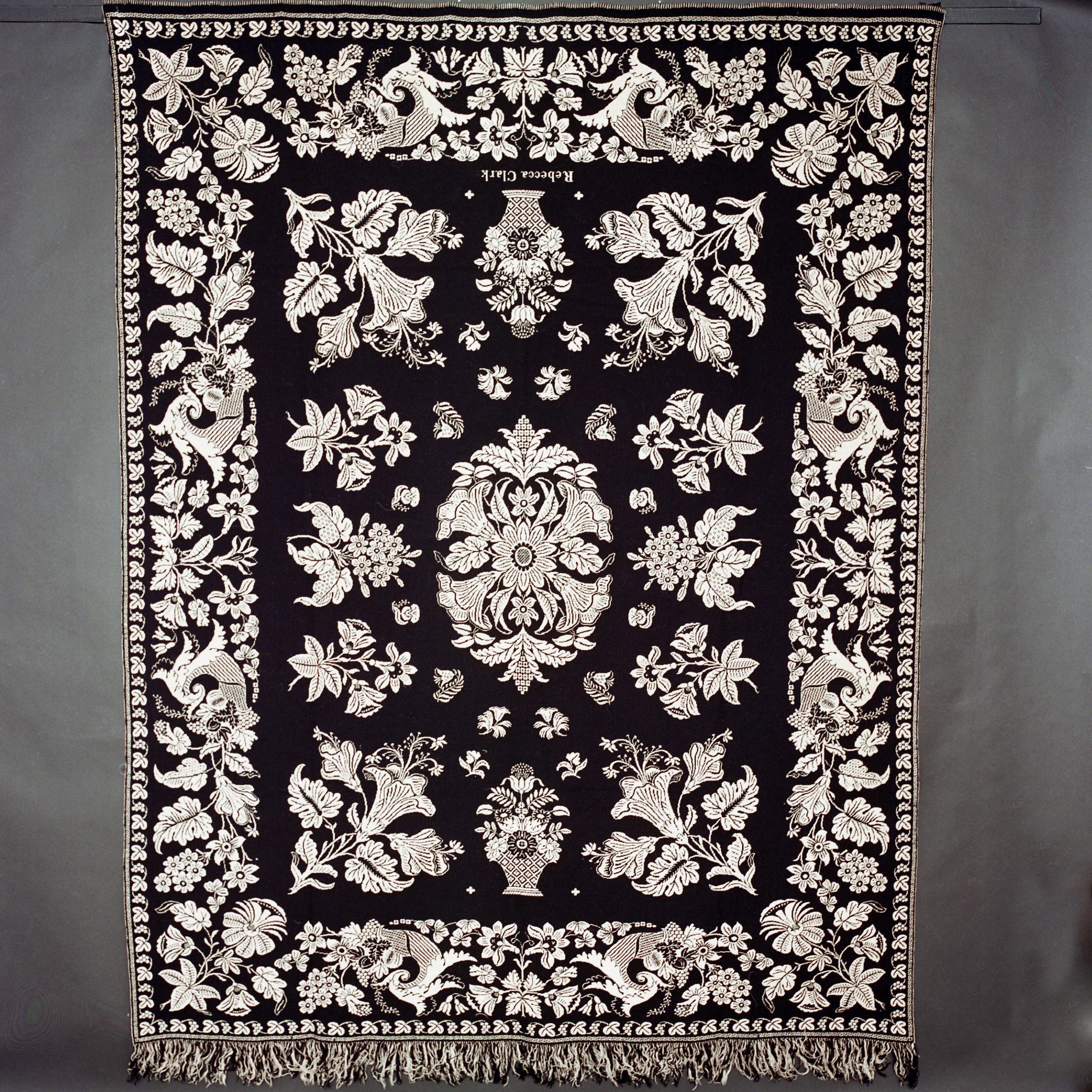 Double weave; navy, natural; fringe on one side; border on 4 sides of cornucopia, flowers, and leaves; centerfield has center medallion flower and large outlying (very distinct flower types); inscription lower center of centerfieldCollection
