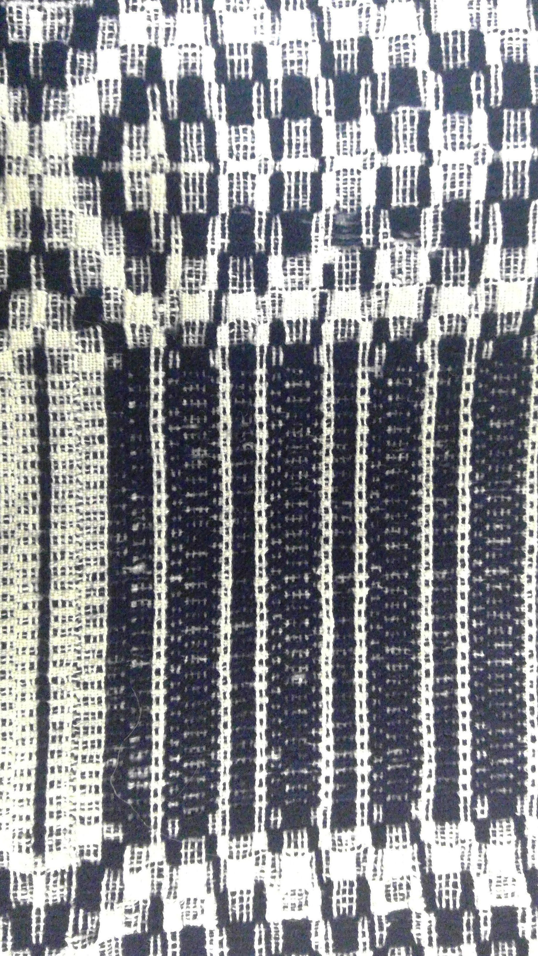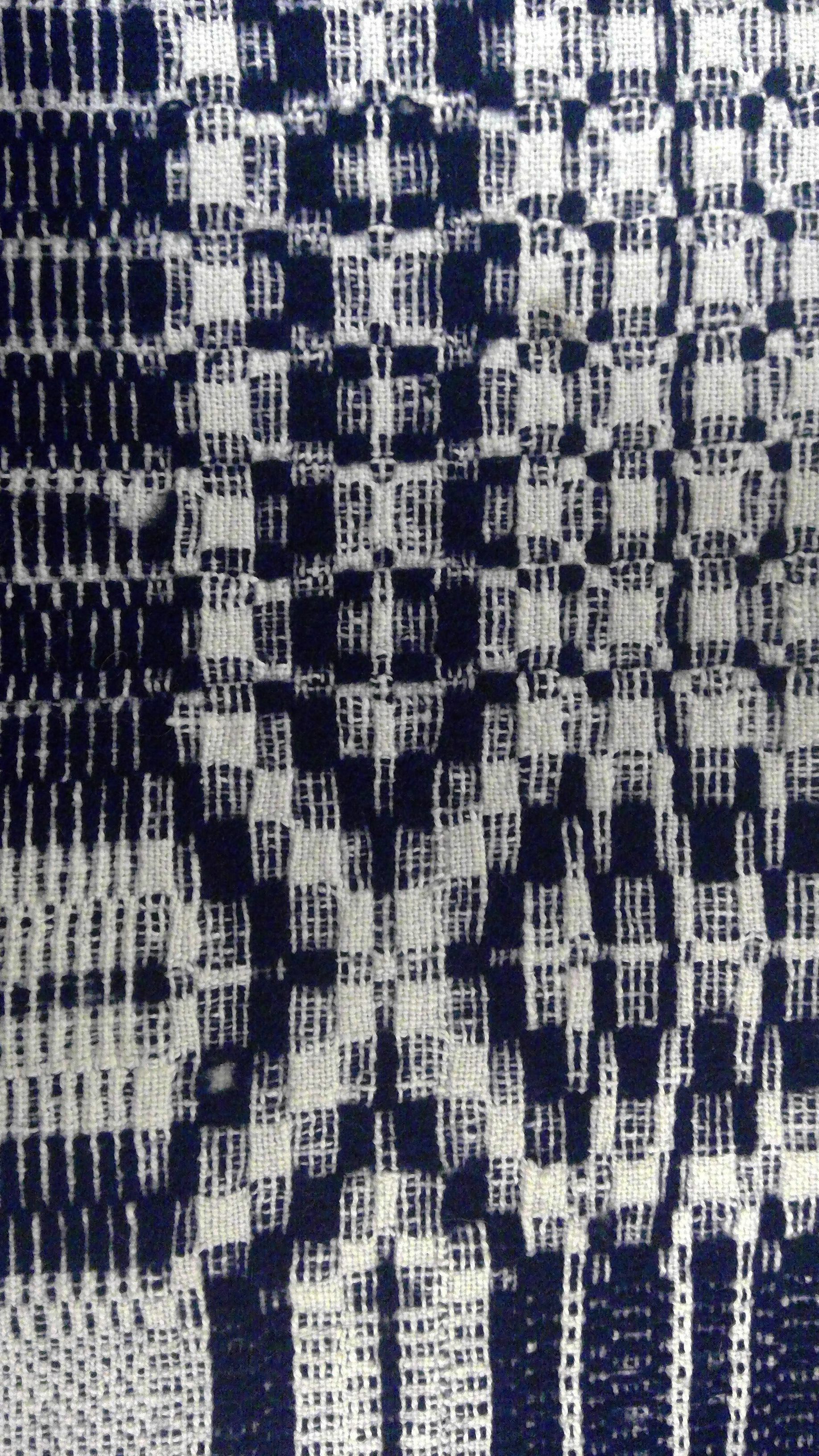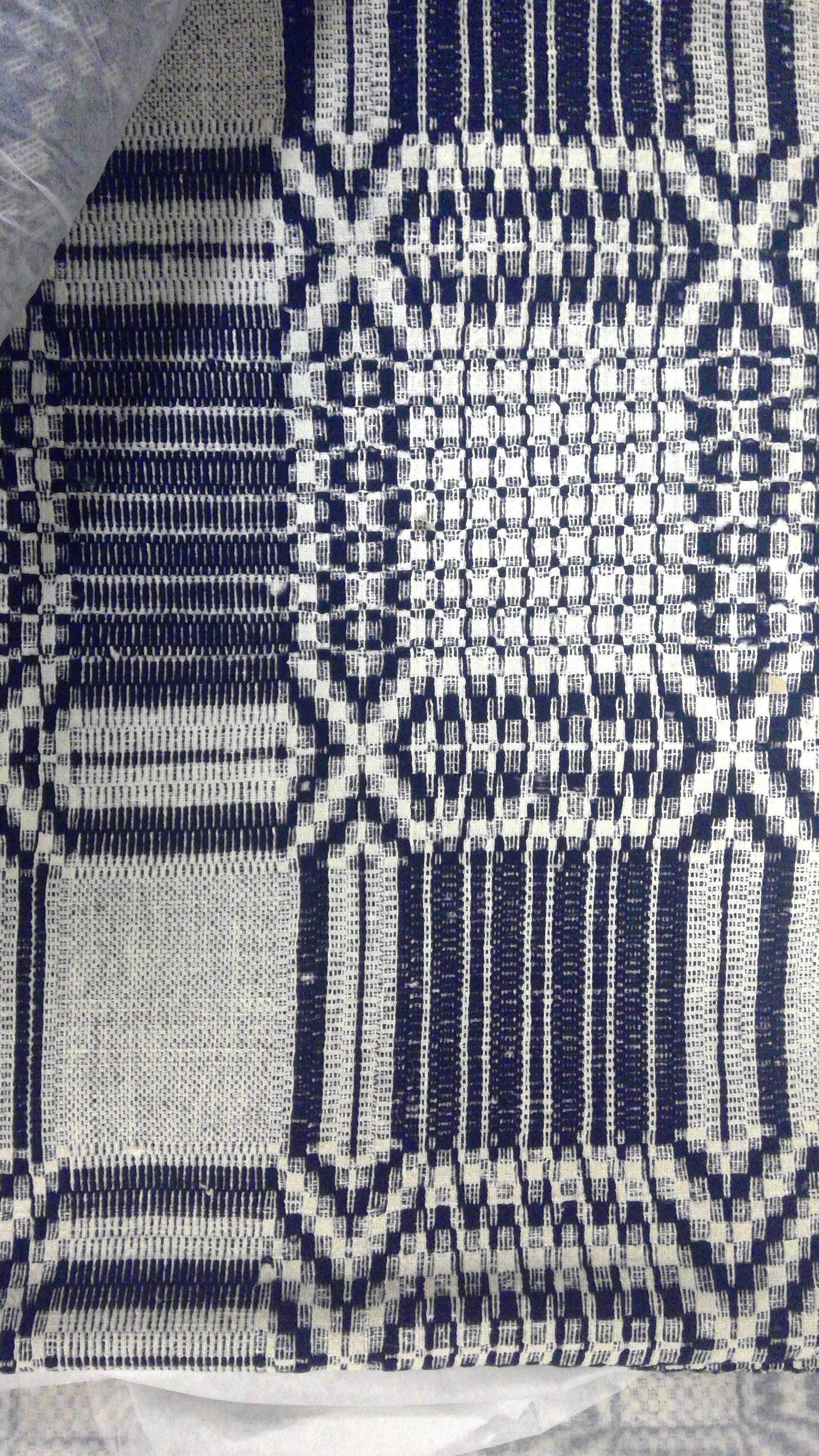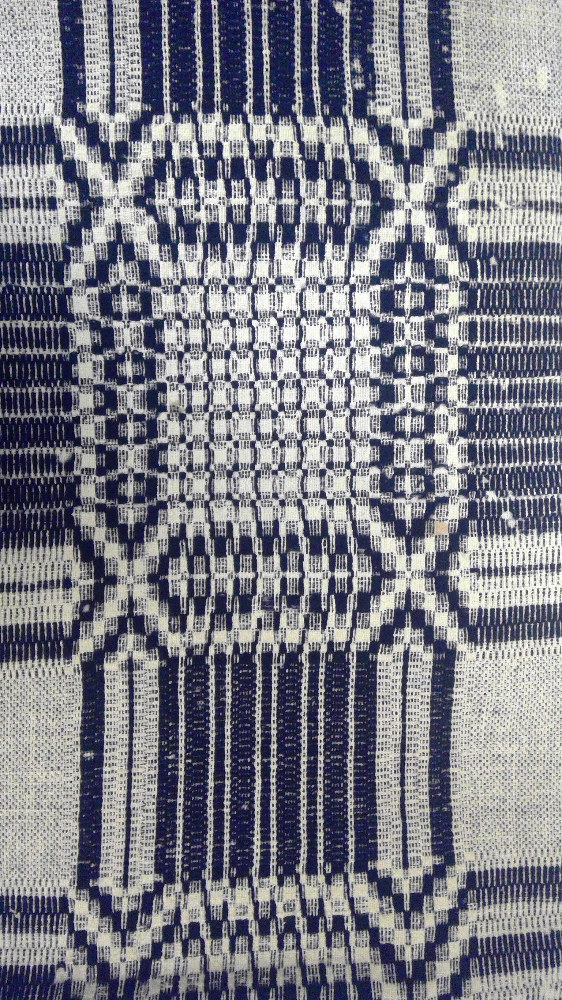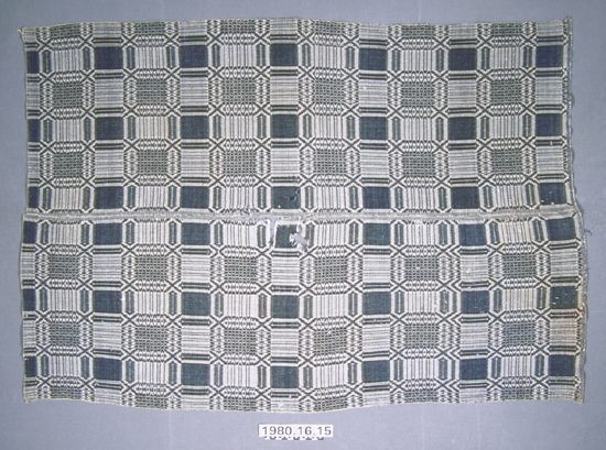 Overshot coverlet; undyed cotton and blue wool. Center seam joins two panels. All edges hemmed; the two side edges have now been turned into the center because of the excessive wear on them. Added fringe along one edge has been cut. Central motif consists of rows of large diamond filled squares with "X"'s in each corner and bands of elogated ovals along sides alternating with rows of smaller squares and stripes.Collection
