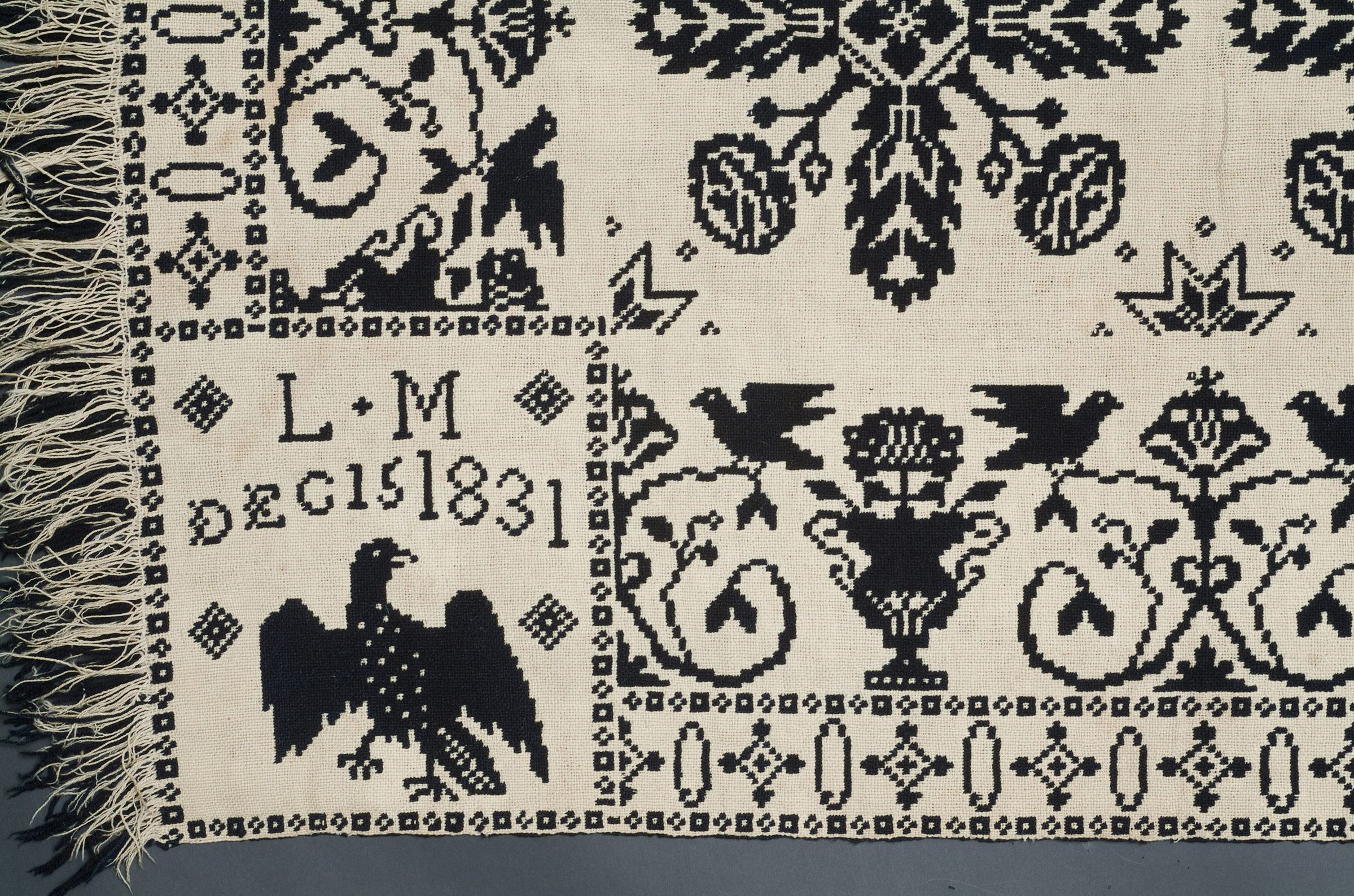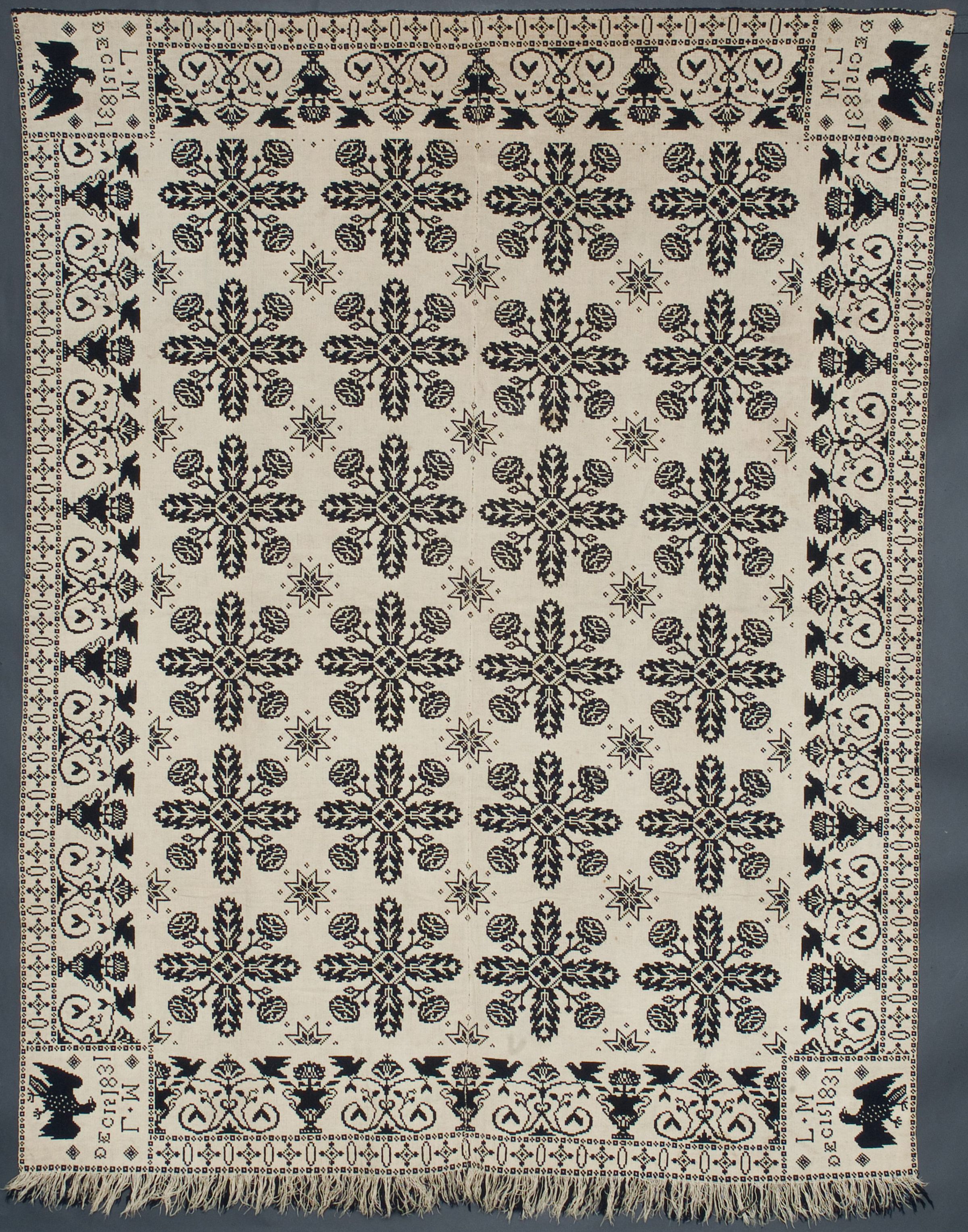 Double weave; navy, natural; two loom widths joined; fringe on one side; border of eagles perched on curling branches and urns; four corner blocks with eagles and inscriptions; centerfield of stars and flowers with leaf clusters, flowers, rosettesCollection