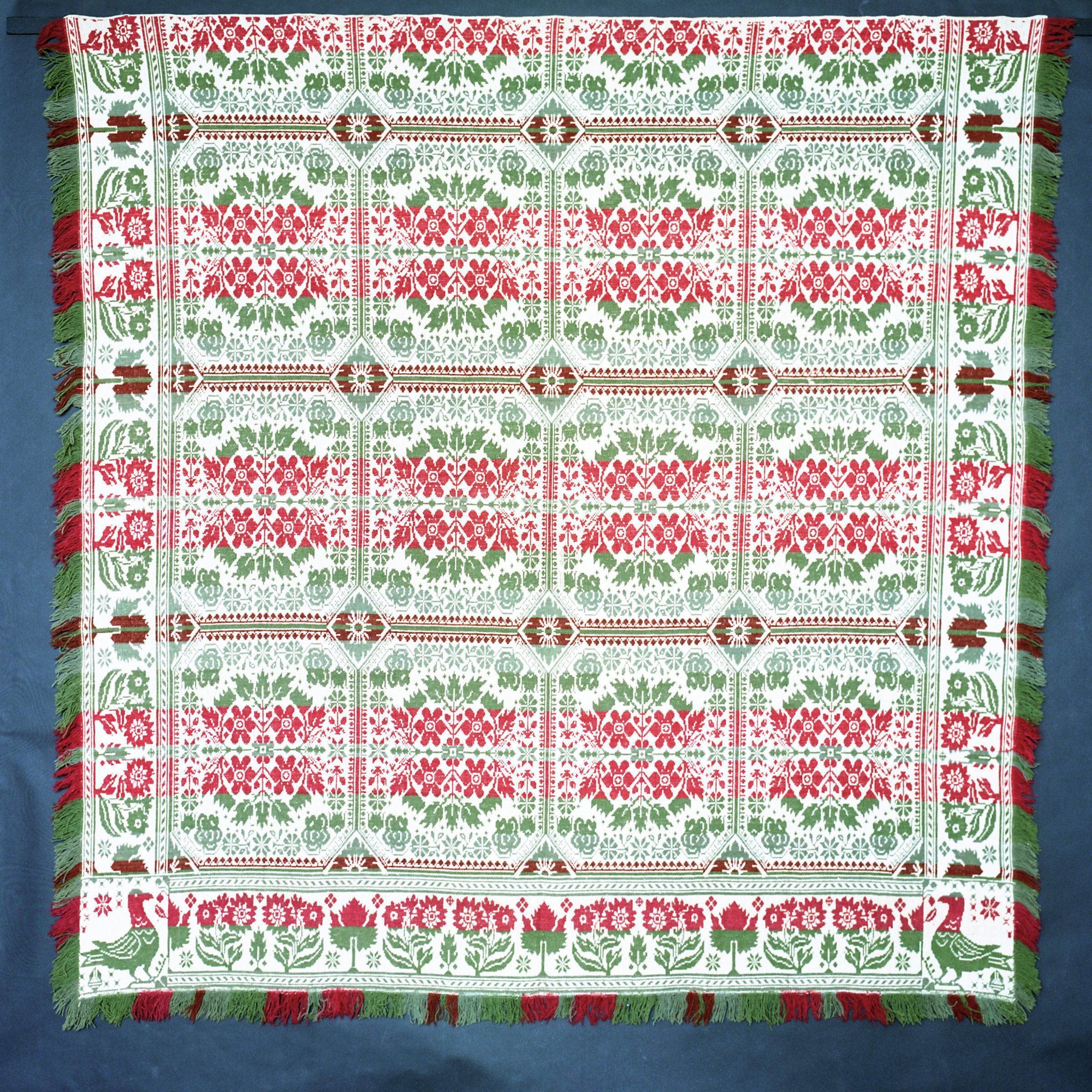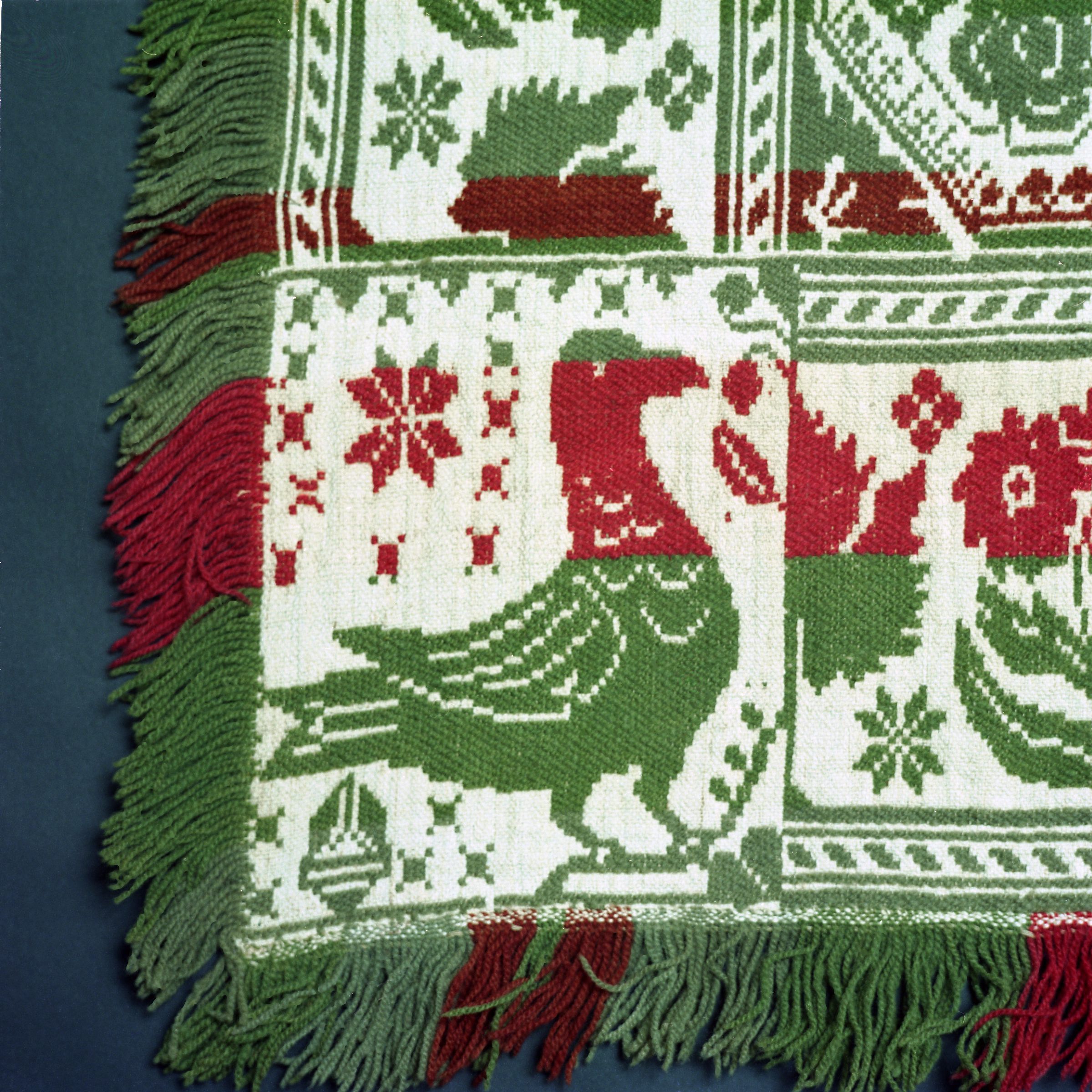 Beiderwand; red, green, natural; seamless; fringe and border on 3 sides; 2 cornerblocks with a star and duck/gull/bird; all 3 borders of flowers and leaves; centerfield of flowers and diamonds; strips of colorCollection