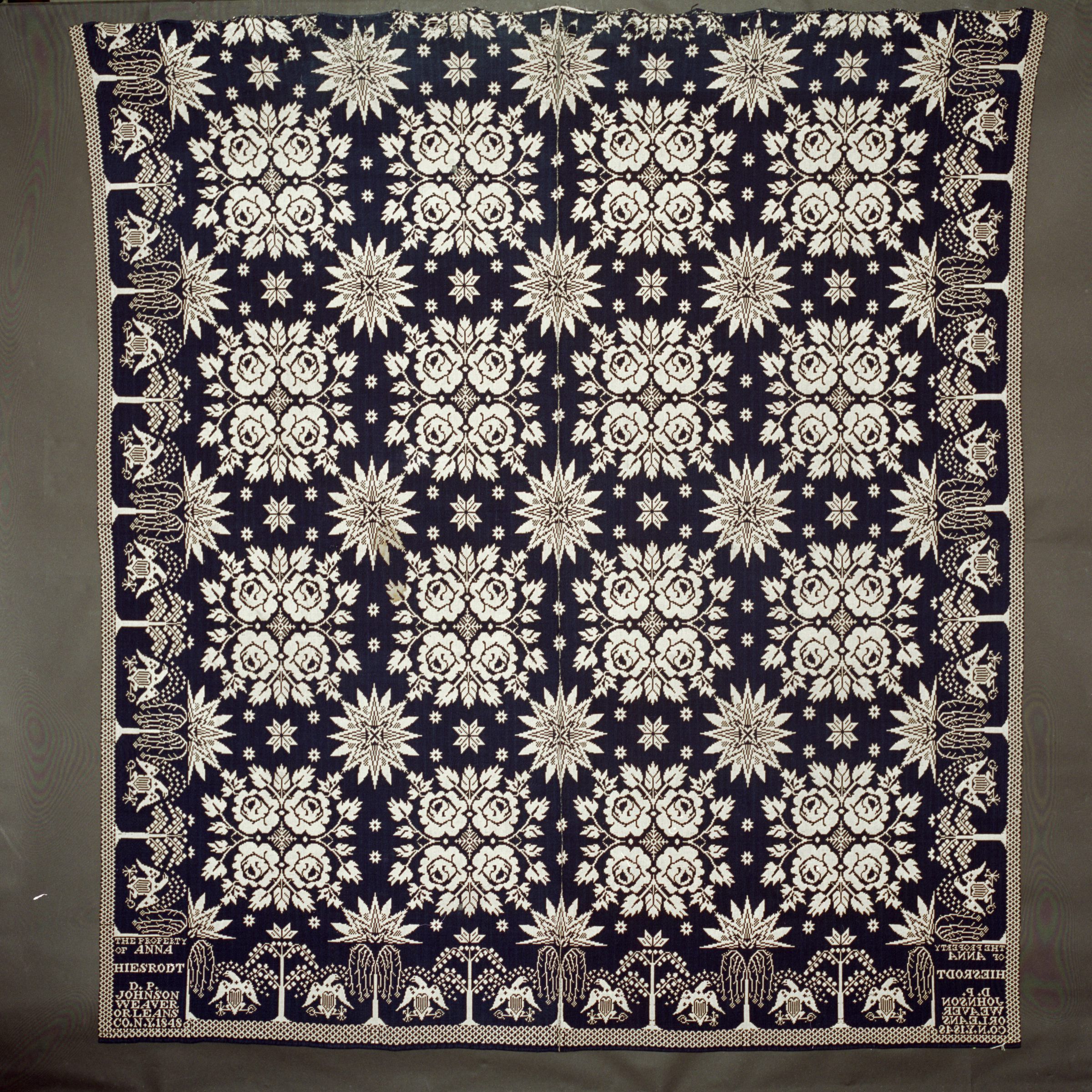 double weave; navy, natural; two loom widths joined; central rose and floral pattern; repeating eagle and tree border with a geometric edge; signature corner blocks; no fringeCollection