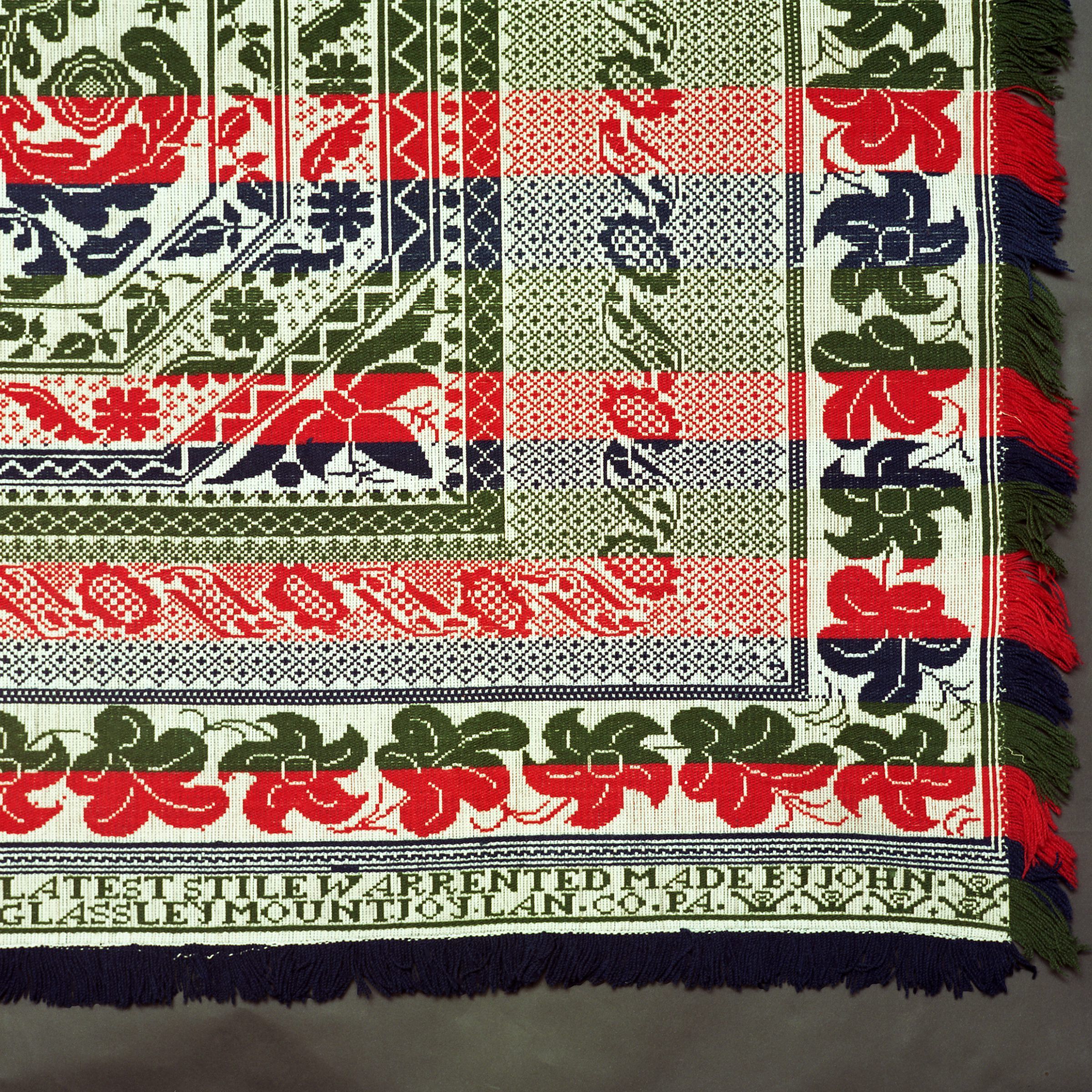 Beiderwand; navy, red, green, natural; seamless; fringe on 3 sides; border on 4 sides of flowers and leaves; floral center medallion surrounded by floral inner borders; no corner blocks; inscription on bottom strip; strips of colorCollection