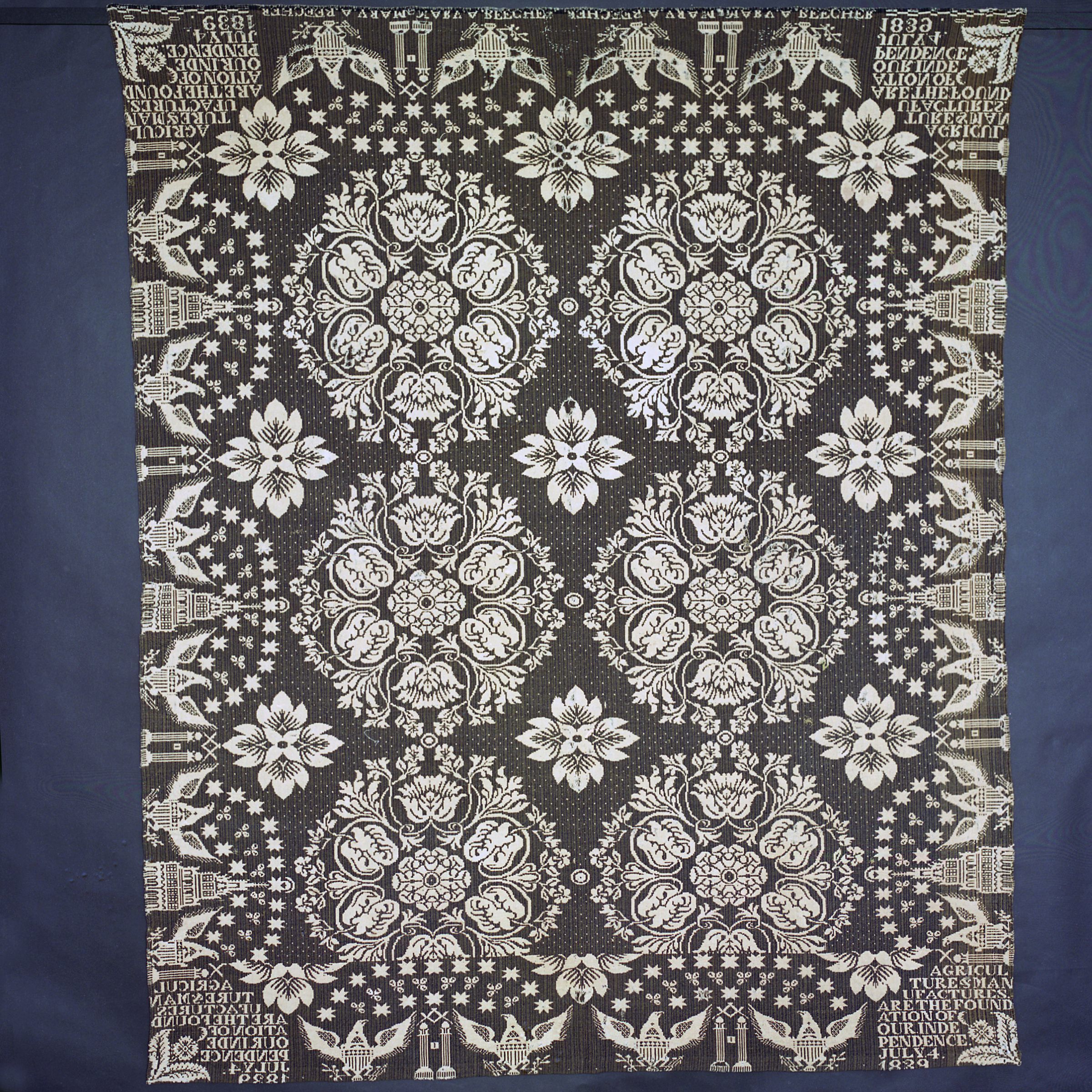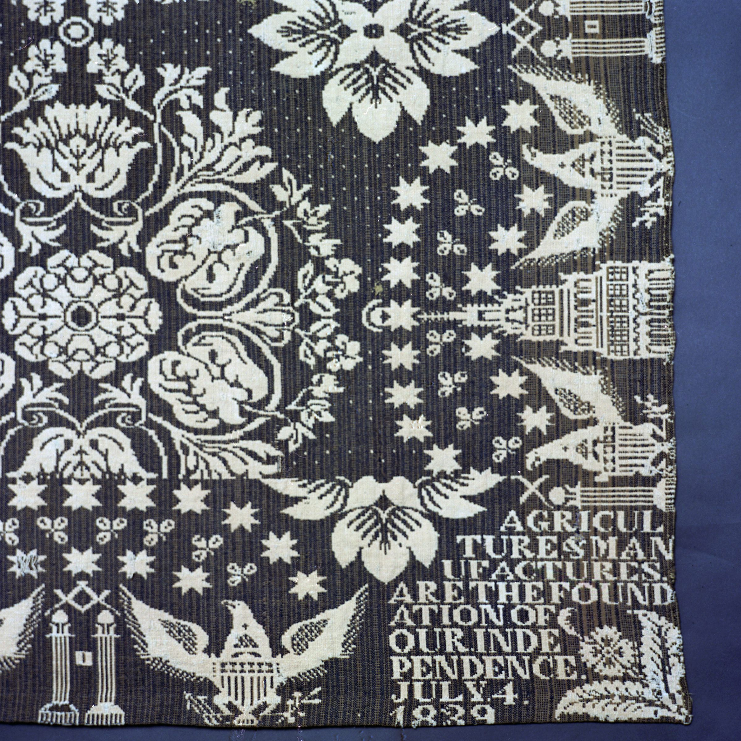 Double weave; navy, natural; seamless; no fringe; border on all 4 sides of shielded eagles under stars, between masonic pillars; side borders also contain 5 story buildings between eagles; centerfield of large floral medallions; 4 corner inscriptions; bottom edge is folded over and top edge has strip of lace on one side.