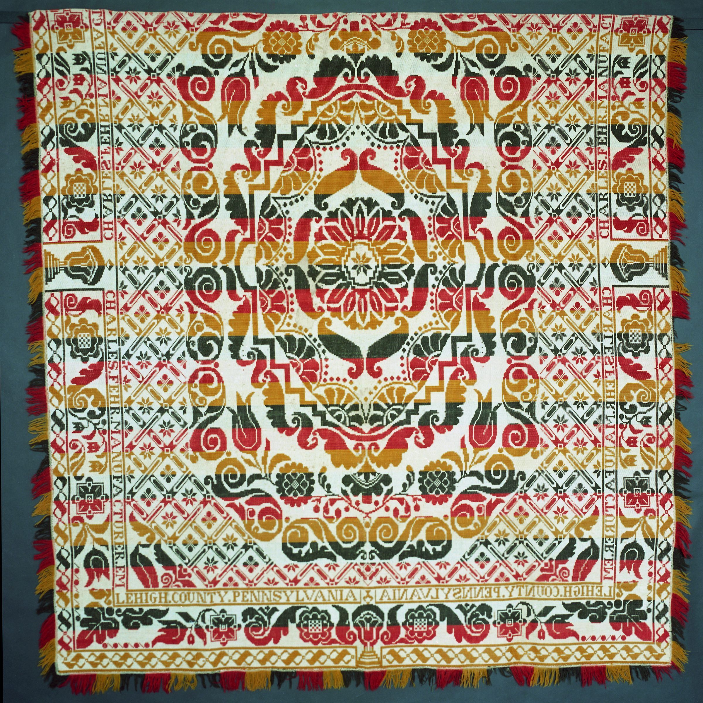 Beiderwand; red, yellow, navy, natural; seamless; fringe and border on 3 sides; outermost border is a ribbon-like pattern; next border is floral; inner border contains inscription; large floral center medallion surrounded by geometric stars
