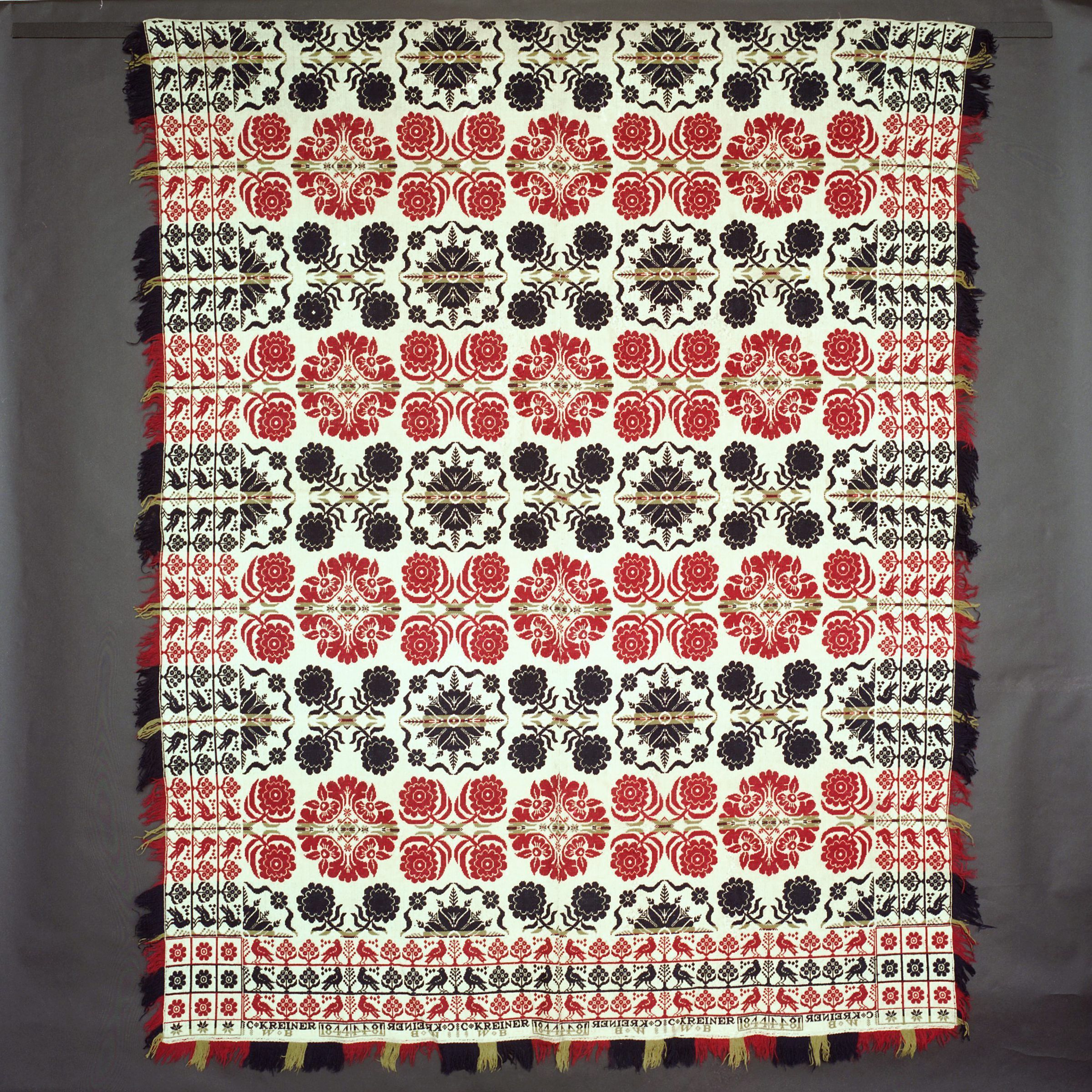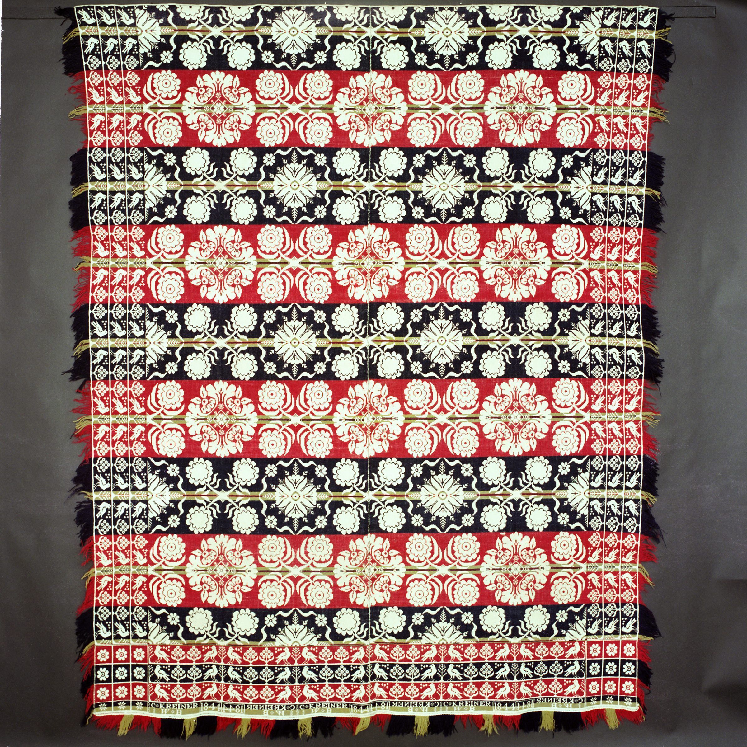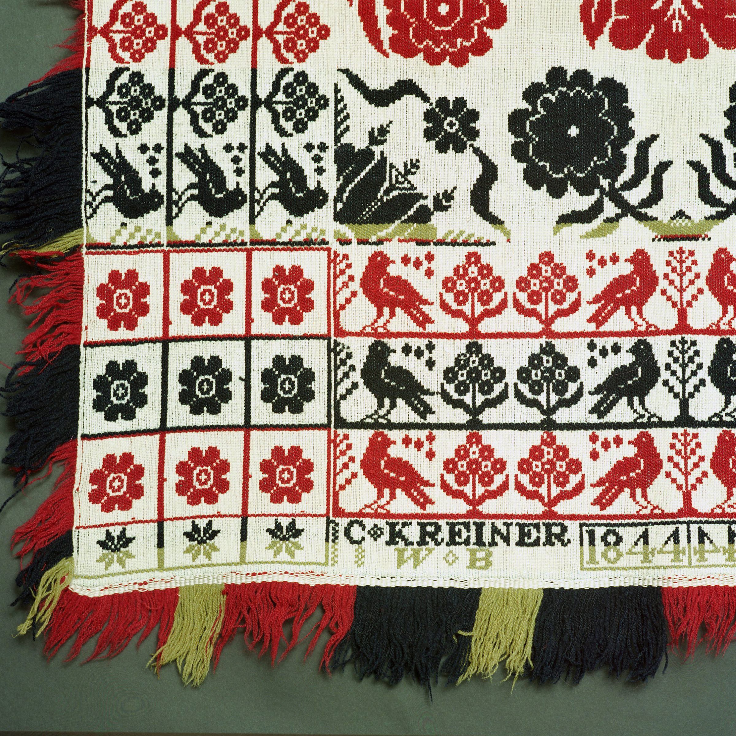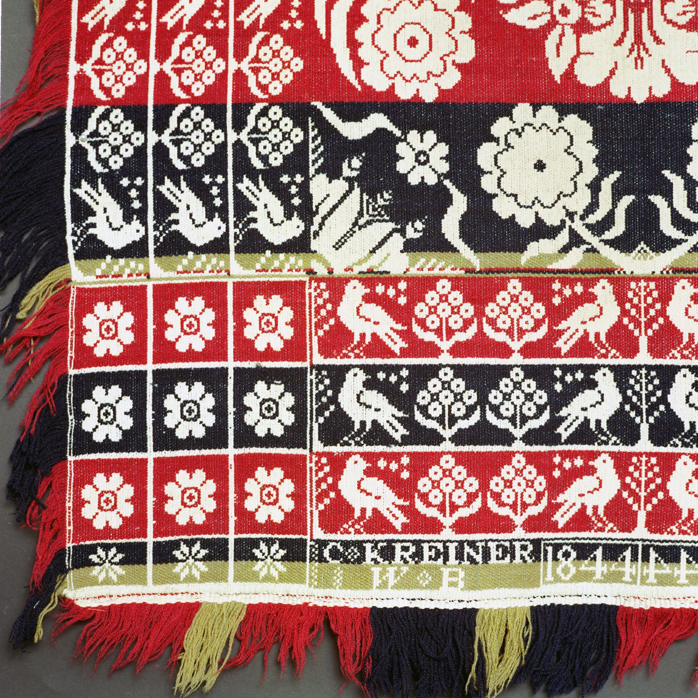 Beiderwand; navy, red, green, natural; two loom widths joined; fringe and border on 3 sides; border is three rows of birds and flowers; the two corner blocks each contain 9 flowers; bottom border has inscription; centerfield of floral clusters, strips of colorCollection