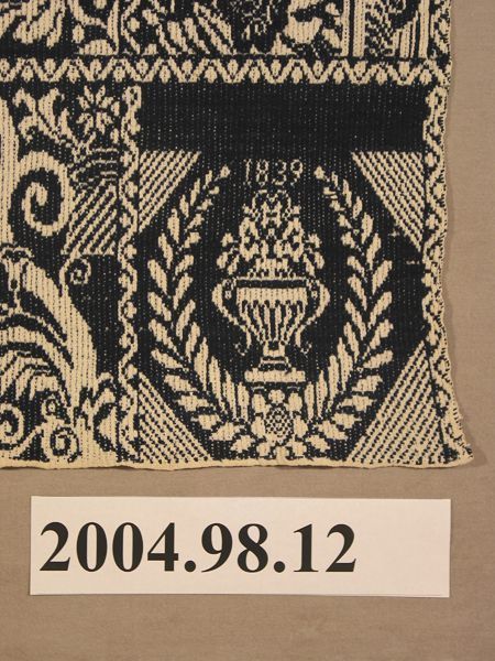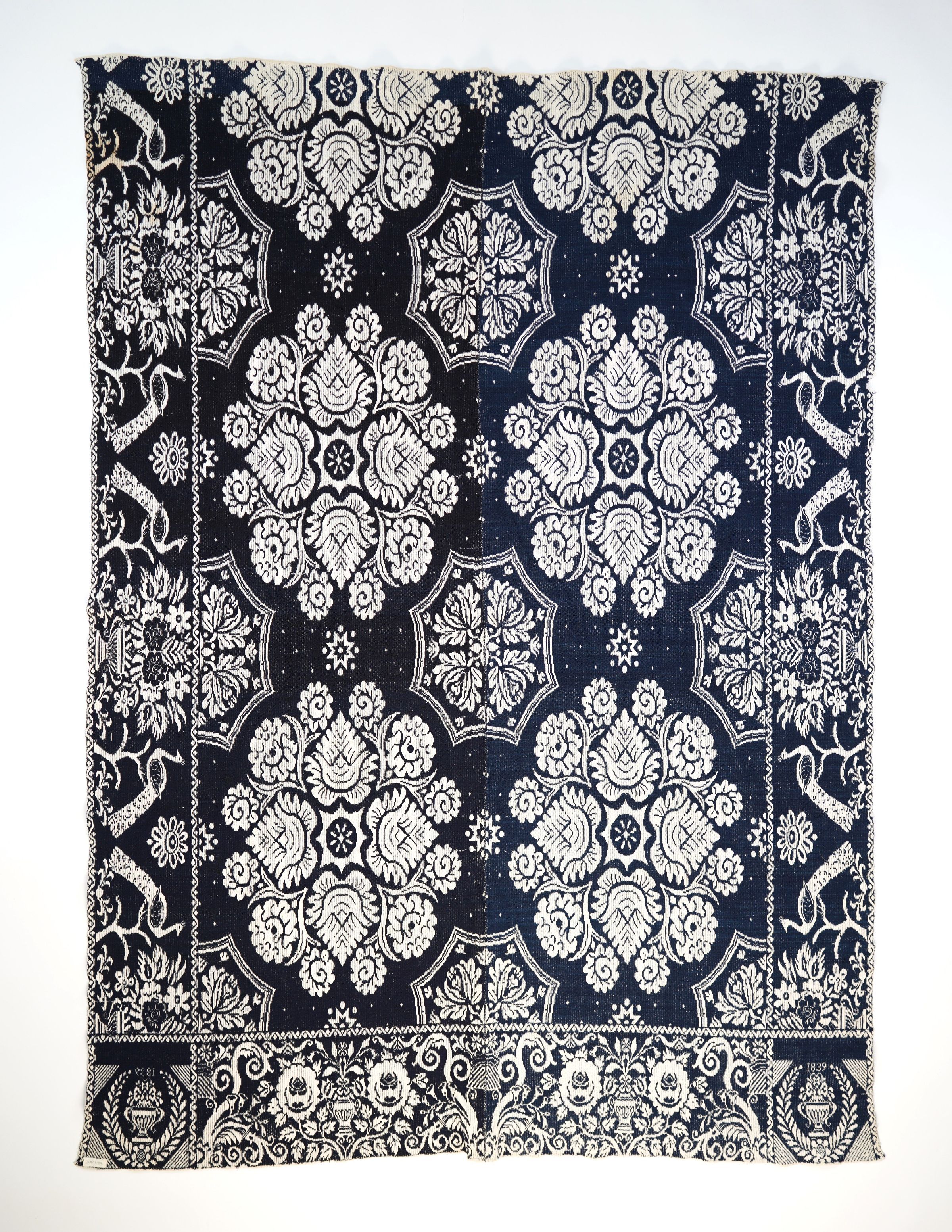 Figured coverlet; undyed cotton and blue wool, tied double cloth (Beiderwand). Coverlet has two panels joined by a center seam. (The color of the blue wool on the right panel and in a 2.5 inch strip at the top of the left panel is lighter than the blue of the remaining left panel.) Selvedges on sides; top and bottom are hemmed. Central motif is a pattern made up of large floral medallions separated by smaller floral medallions framed within a curved eight-sided shape. Border contains peacocks and oval vases filled with flowers. Corner blocks contain an urn encircled by leaves and the woven text.Collection