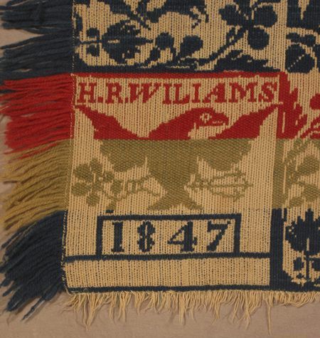 Figured coverlet; undyed and blue cotton and red, blue, and green wool, tied double cloth (Beiderwand). Hemmed at top, fringed on sides and bottom. Central motif is of quilt-like blocks in horizontal bands. Some rows contain blocks framed in square and circle shapes. At the center of each square is sixteen-pointed flower; at the center of each circle is an eight-pointed star surrounded by eight smaller stars. The other rows consist of alternating sunflower-like flowers and a block of four joined leavles framed by a curving octagon pattern. Border has a rose bush motif. Corner blocks contain an eagle motif and the woven text.Collection