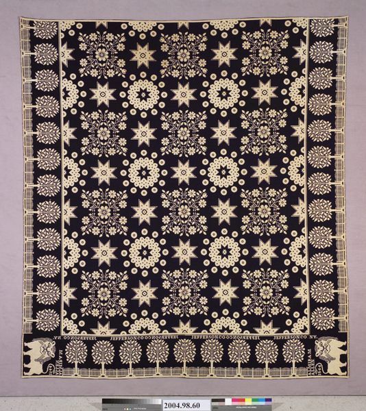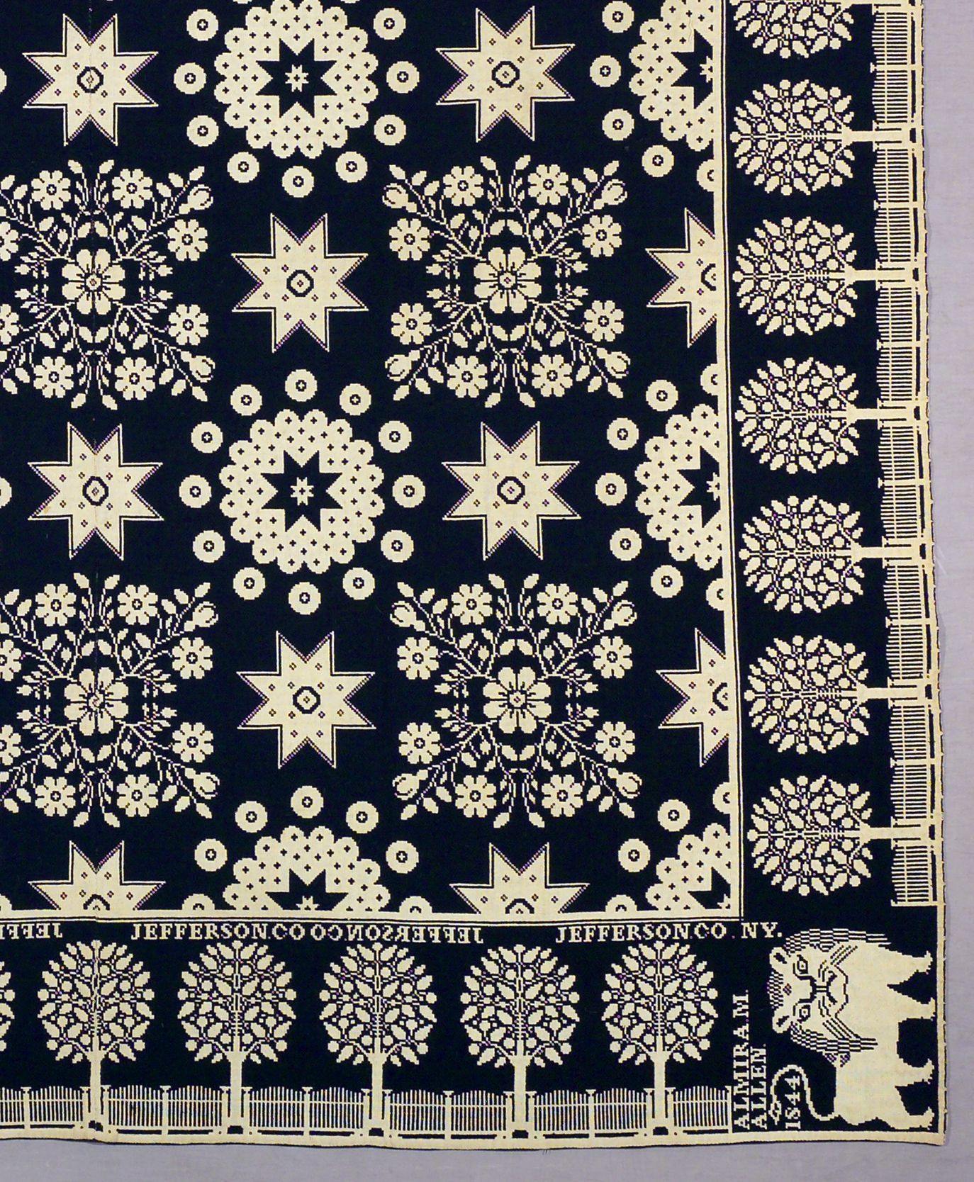 Figured coverlet; undyed cotton and blue and blue wool, double cloth. Center seam joins two panels. Selvedges on sides; top and bottom hemmed by turning cloth towards one another and sewing closed. Central motif contain several different medallions. One has a rosette at its center and floral vines radiating from it forming a square; another is an eight-pointed star within a rounded petal shape, this is then surrounded by dots. The medallions alternate with an eight-pointed star. Borders on side and bottom are of trees flanked by an arched picket fence. The corner blocks in the bottom contain Harry Tyler's trademark lion and the woven text.Collection