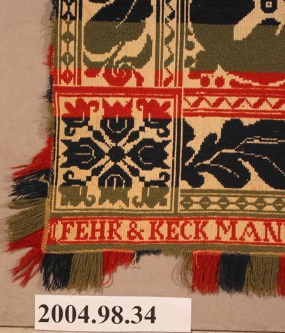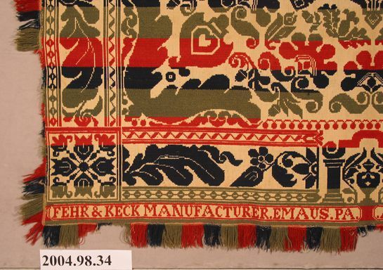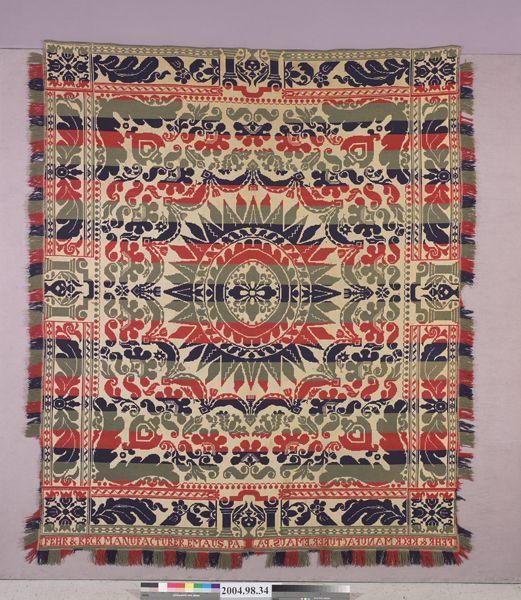 Figured coverlet; undyed and dark blue cotton and blue, red, and green wool, tied double cloth (Beiderwand). Hemmed at top, fringe attached to tree sides. Central motif consists of a stylized sun medallion with a quatrefoil at its center. Tasseled swags surround the medallion, as do stylized flowers. In the corners of the center field there are large leaves with a heart shaped flower. Border consists of leaves framed in a rectangular shape, separated in the center by structure pillared arbor. Under the arbor, there is an urn. Framing the border on top is a zigzag line; on the bottom are diamonds connected by a line. Corner blocks contain a tulip medallion.Collection