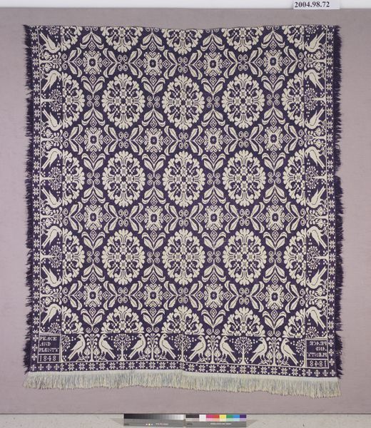 Figured coverlet; undyed and blue cotton and blue wool, tied double cloth (Beiderwand). Coverlet has two panels joined by a center seam. Hem on top is turned under and stitched closed; fringe on sides and bottom. Central motif is a variation on four roses set on point that alternate with stylized thistle. Woven text in bottom corners. Border consisting of pairs of birds flanking trees is on bottom and sides. A secondary border is on the outer edge and contains a row of eight pointed stars.Collection