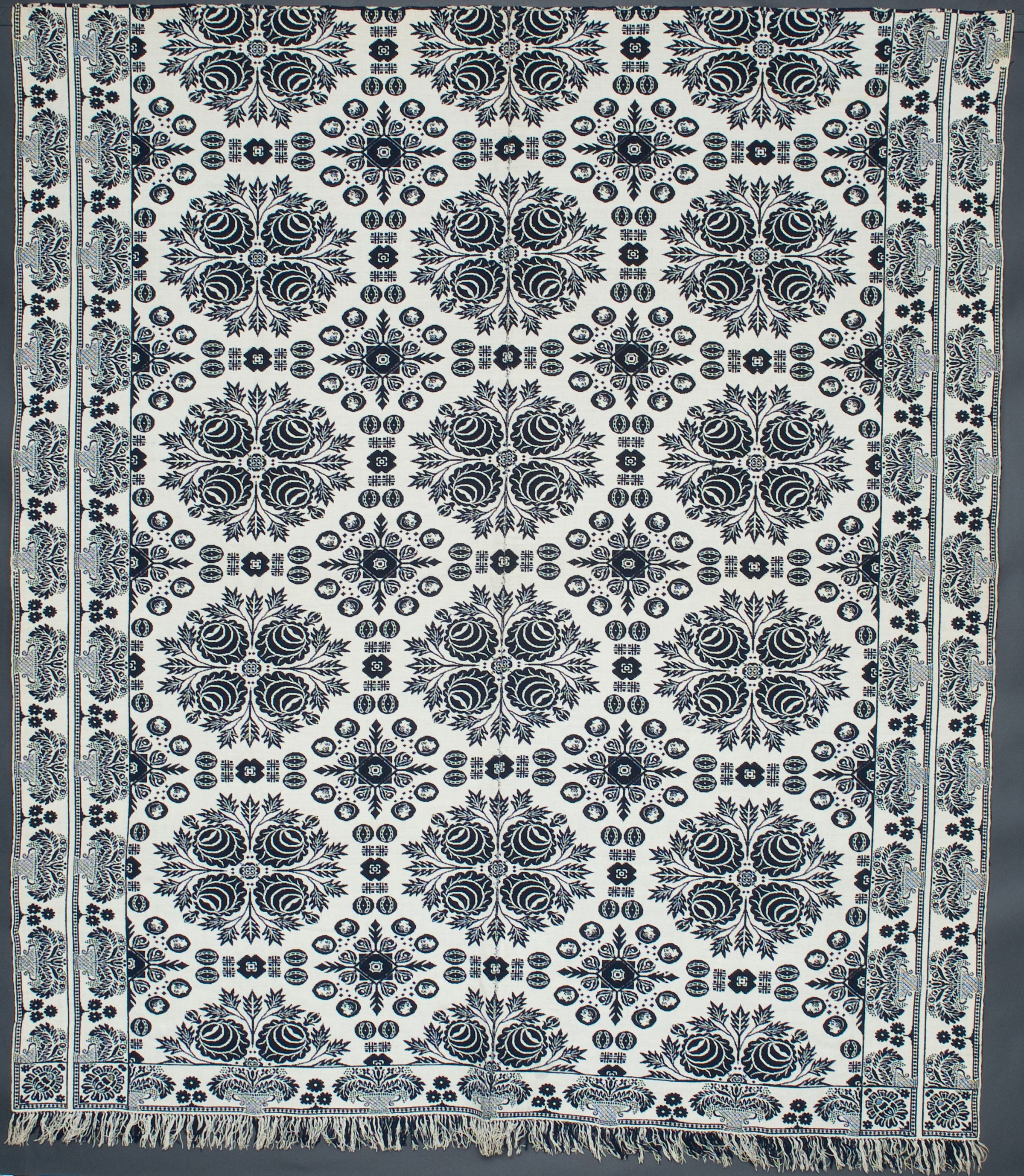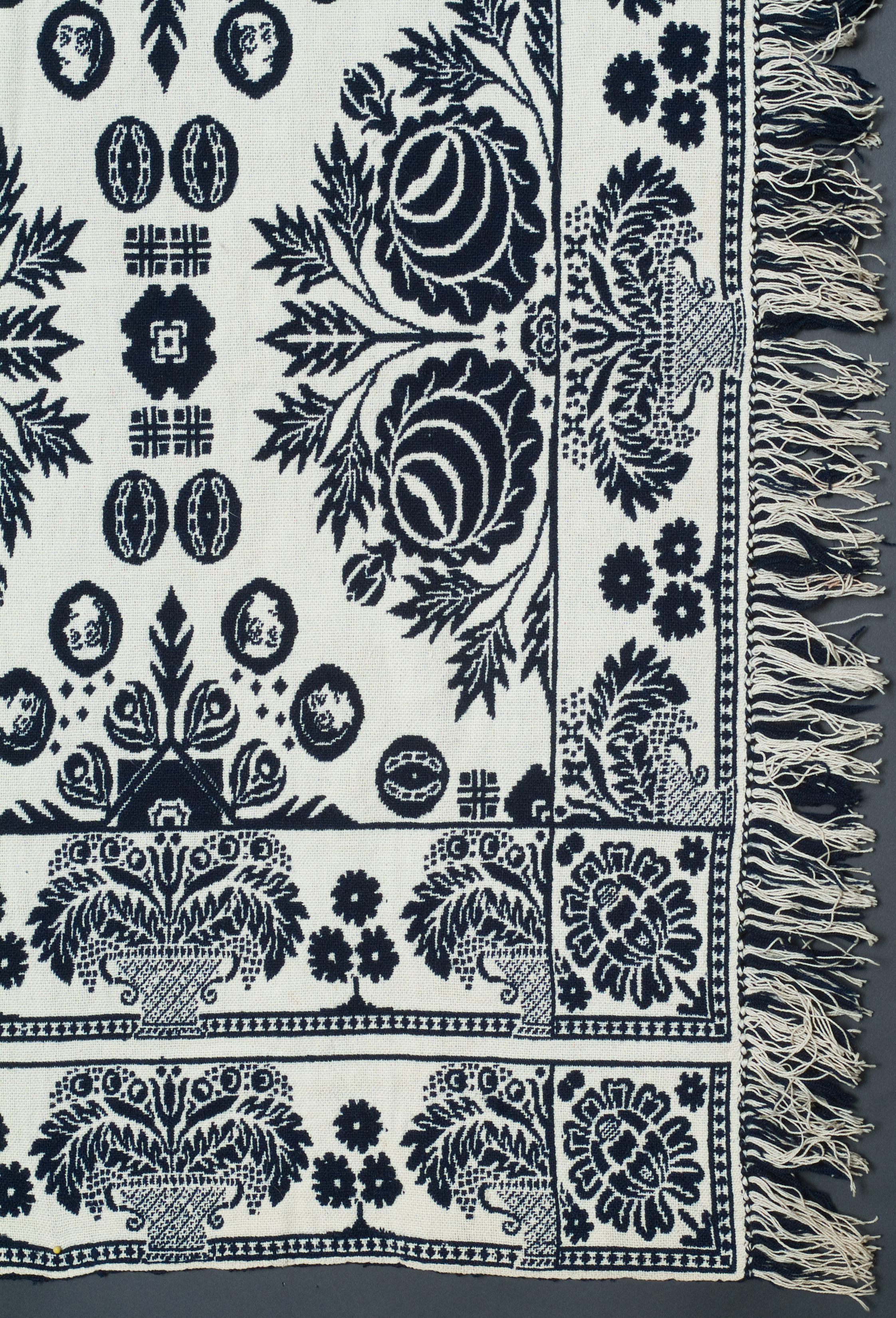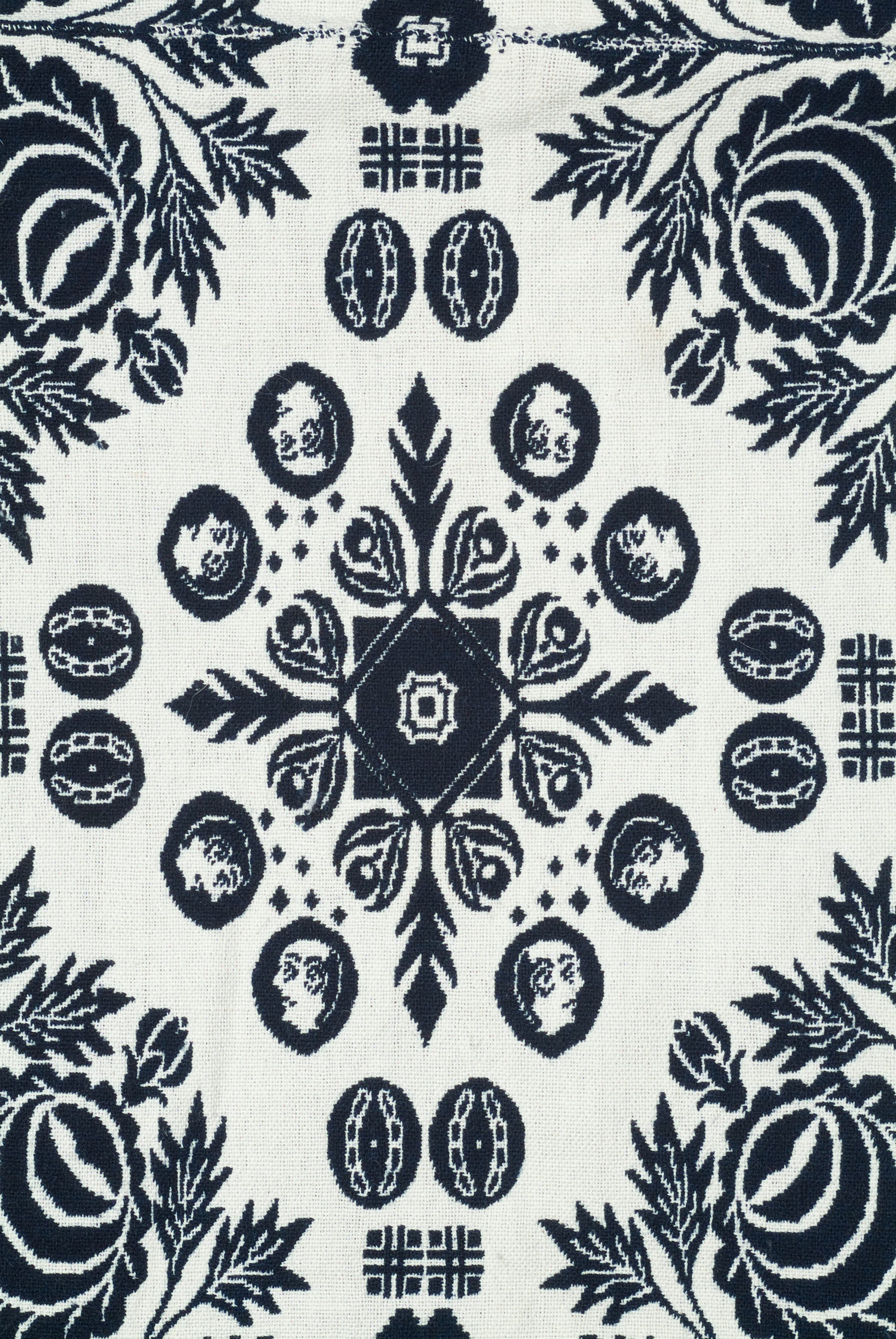 double weave; navy and natural; two loom widths joined; double border on 3 sides with a bouquet motif; floral centerfield with portraits of a man's head; fringe on the bottomCollection