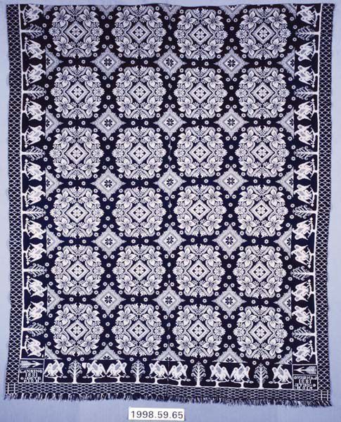 Figured coverlet; undyed cotton and blue wool, double cloth. Center seam joins two panels. Selvedges on either side. Hemmed top, fringed bottom. Central motif consists of medallions with four lilies surrounding a diamond that has an eight-pointed flower at its center. Separating the lily medallions are diamond motifs are small sunbursts. Borders are along three sides and contain a repeating pattern of two eagles separated by stylized trees. Secondary borders have a diamond pattern. The corner blocks are on the lower corners have woven text below an arrow.Collection