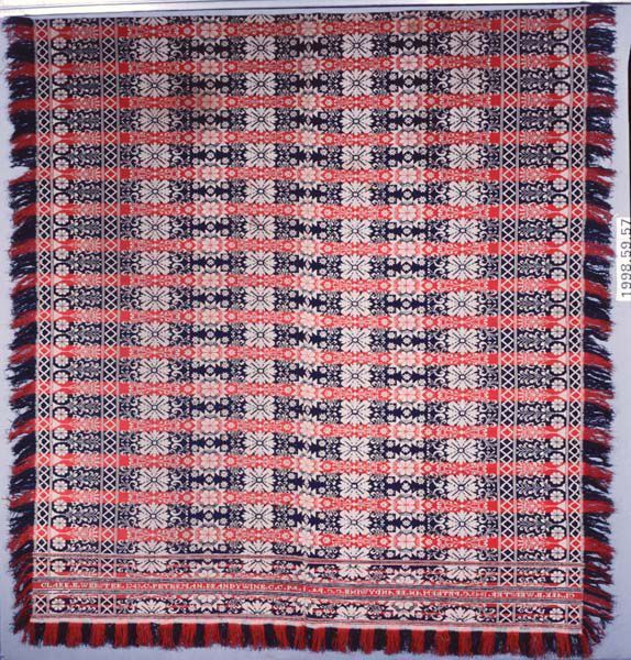 Figured coverlet; undyed cotton and red and blue wool, tied double cloth (Beiderwand). Center seam joins two panels. Hemmed top, fringed sides and bottom. Central motif consists of two medallions in alternating vertical columns. One is a floral motif where the main petals form an "X"; the other is a sixteen pointed star with a fleurette in the center. The floral motifs are surrounded by scrolling leaves and the star is surrounded by smaller stars. The coverlet has a ground of alternating red and blue horizontal bands. The bottom border is actually a continuation of the field pattern that has been separated from the field by thin stripes. This bottom border is further separated by the woven text. Side borders have interlocking diamonds edging the main motif of stylized trees and fleurettes.Collection