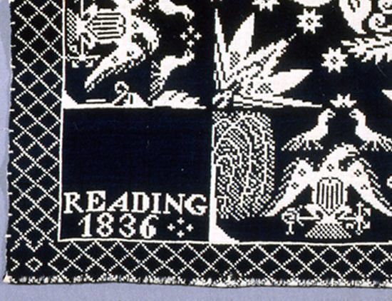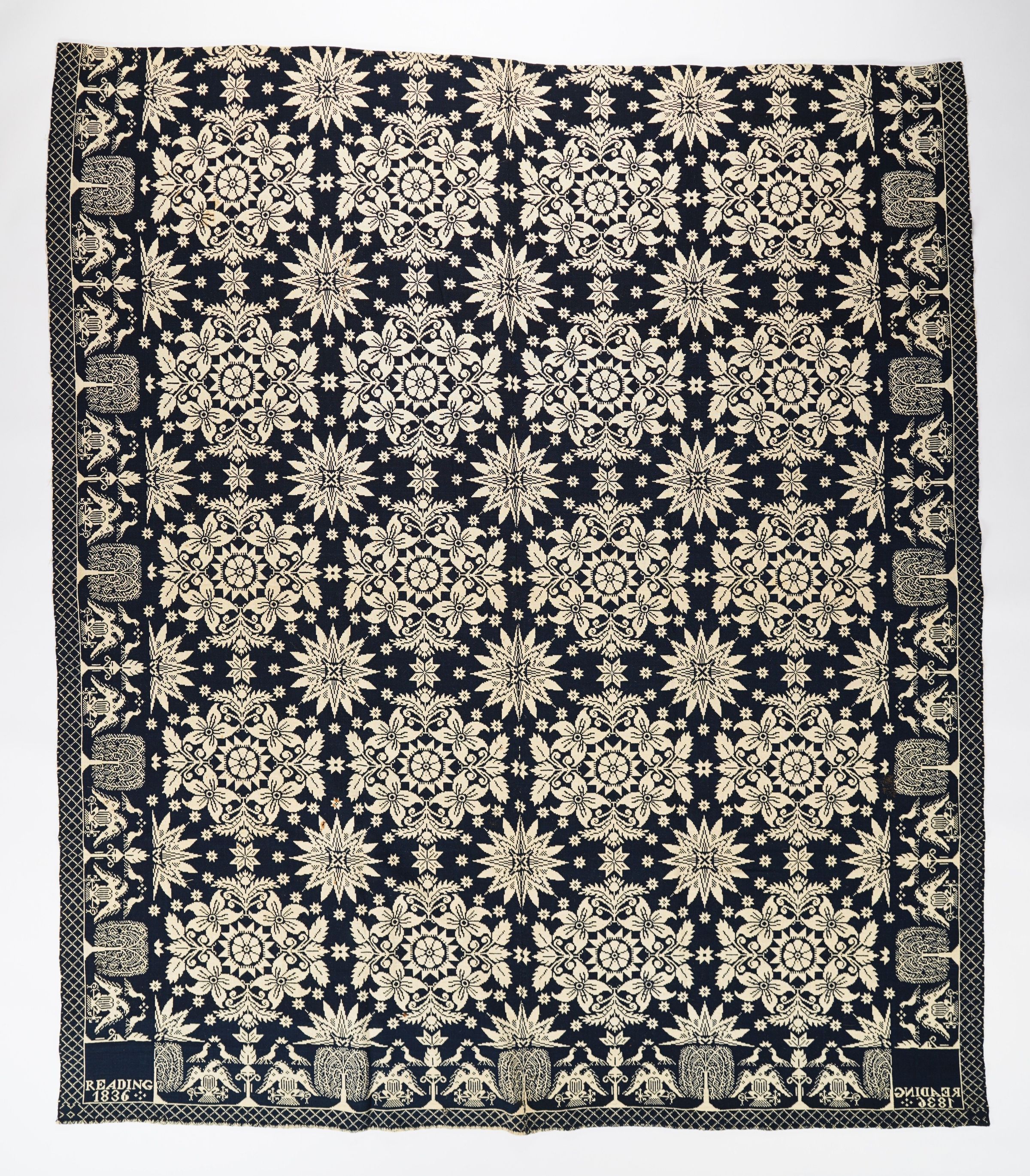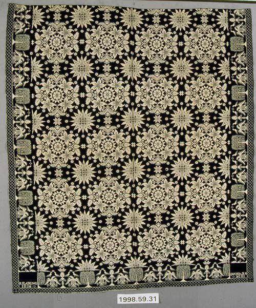 Figured coverlet; undyed cotton and blue wool, double cloth. Center seam joins two panels. Selvedges on either side, hemmed top and bottom. The central motif consists of medallions composed of four lilies surrounding a starburst design. Separating the rows of lily medallions is another starburst motif, these are surrounded by a circle of small stars. Borders on three sides show a spread eagle with a shield on its breast. Over the wings of the eagle are two birds. A stylized tree separates the two eagles which are facing one another and a weeping willow tree separates the pair of eagles. Secondary borders have a diamond design.Collection