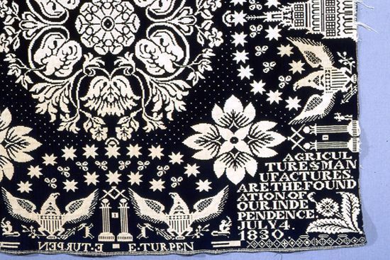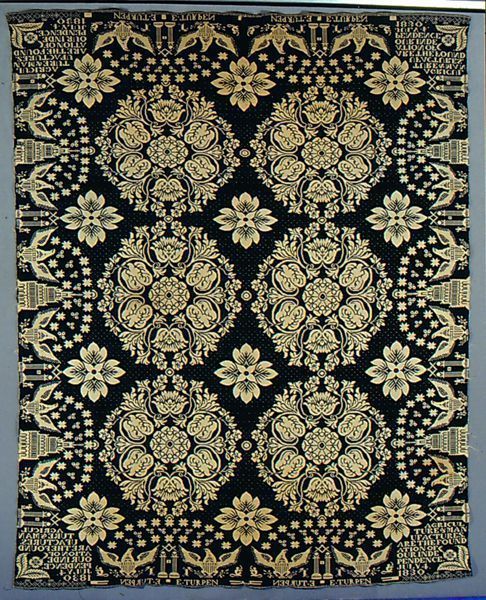 Figured coverlet; undyed cotton and blue wool, double cloth. Center seam joins two panels. Selvedges on either side; hemmed top and bottom. Central motif consists of six circular floral medallions. The medallions are composed of an open petaled flower surrounded by a tulip and leaf design. Between the medallions are floral motifs. The border is on all sides and contains an eagle on either side of Independence Hall and two columns with the compass and square on top of the columns. Stars form an arch to enclose the eagle designs. The building motif is only in the side border; however, the eagle and column pattern do continue on the top and bottom borders.Collection