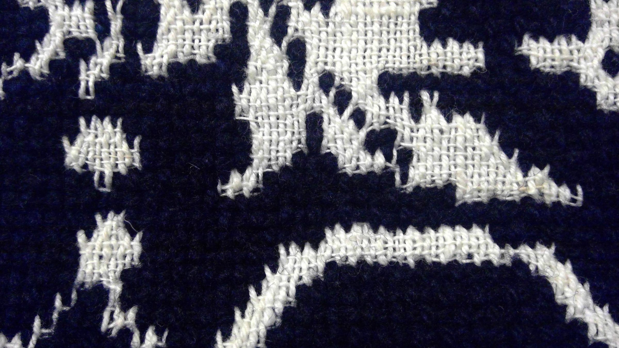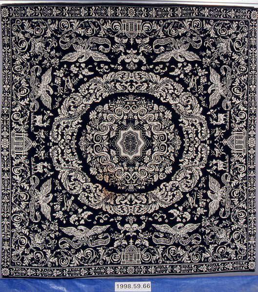 Figured coverlet; undyed cotton and black wool, double cloth. Selvedges on sides; hemmed at top and bottom. Central motif is a single circular floral and scroll medallion with an eight-pointed star. Medallion is surrounded by a chain of scrolls and vines. On each side around this central motif are a pair of eagles, a pair of reindeer, a pair of birds on a branch, and a building (possibly a church). Each eagle carries a scroll, and a chain of scrolls and leaves links the buildings. Smaller foliage motifs are interspersed throughout. A narrow stylized floral border is on all sides with a single highly stylized floral motif in each corner.Collection