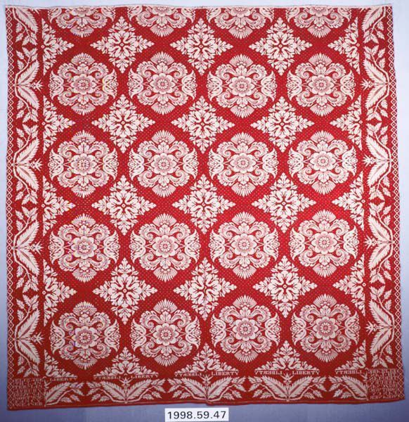 Figured coverlet; undyed cotton and red wool, double cloth. Center seam joins two panels. Selvedges on either side. Top edge bound, bottom hemmed. Central motif consists of two types of medallions. One is an elliptical floral medallion, with a tulip design on either side of an eight-pointed flower and a thistle with scroll leaves on the top and bottom. The other medallion is a diamond shaped leaf motif. The diamond design has a cross shaped center with a foliage design on the sides. A dotted field fills the areas between the designs. The border has a foliage motif with two large leaves in the shape of a V surrounded by smaller leaves. The border along the bottom is the same as the one which is on the sides, except that the word "Liberty" runs along the upper edge of the border. A narrow secondary border runs along the sides with a diamond enclosing the dot design.Collection