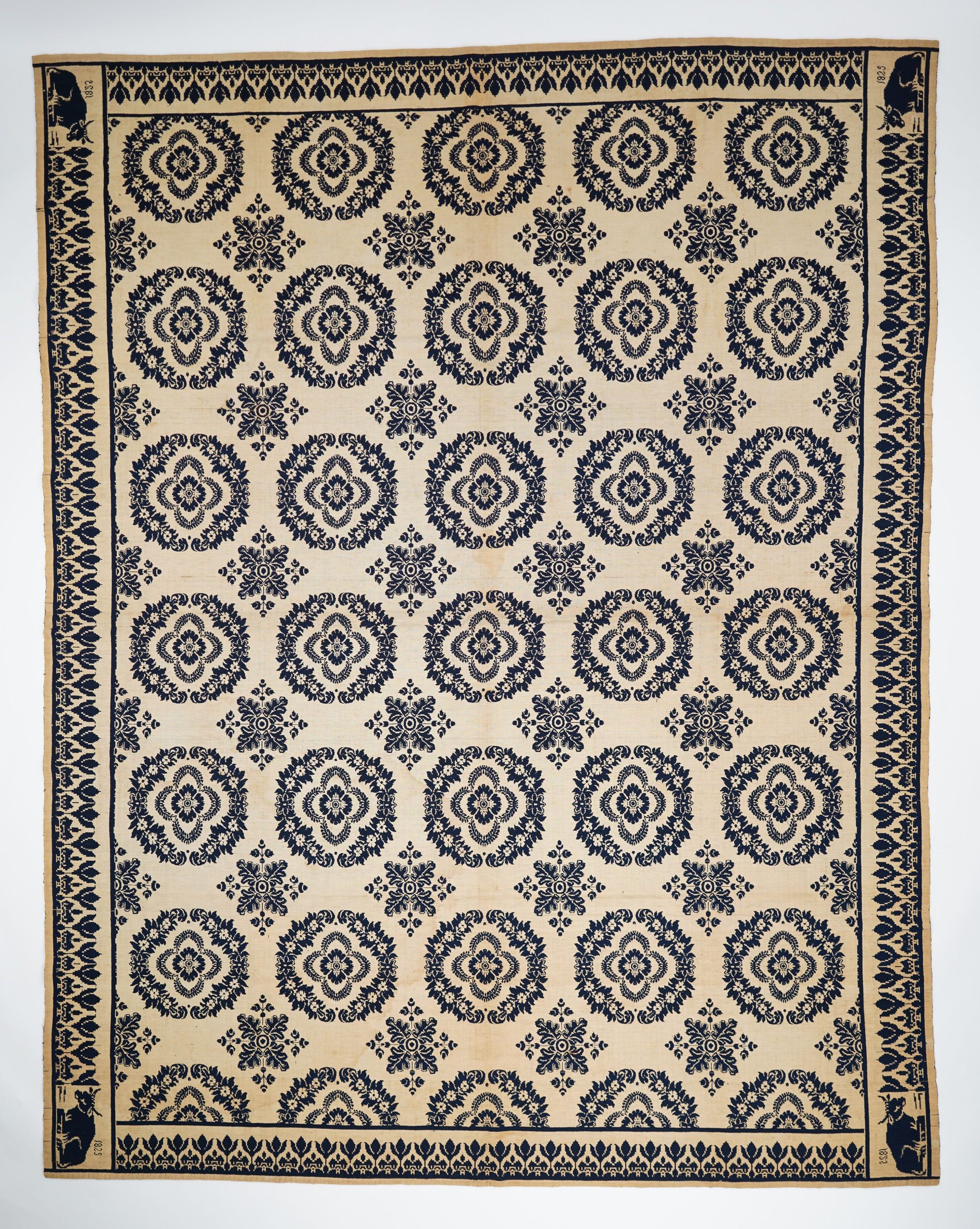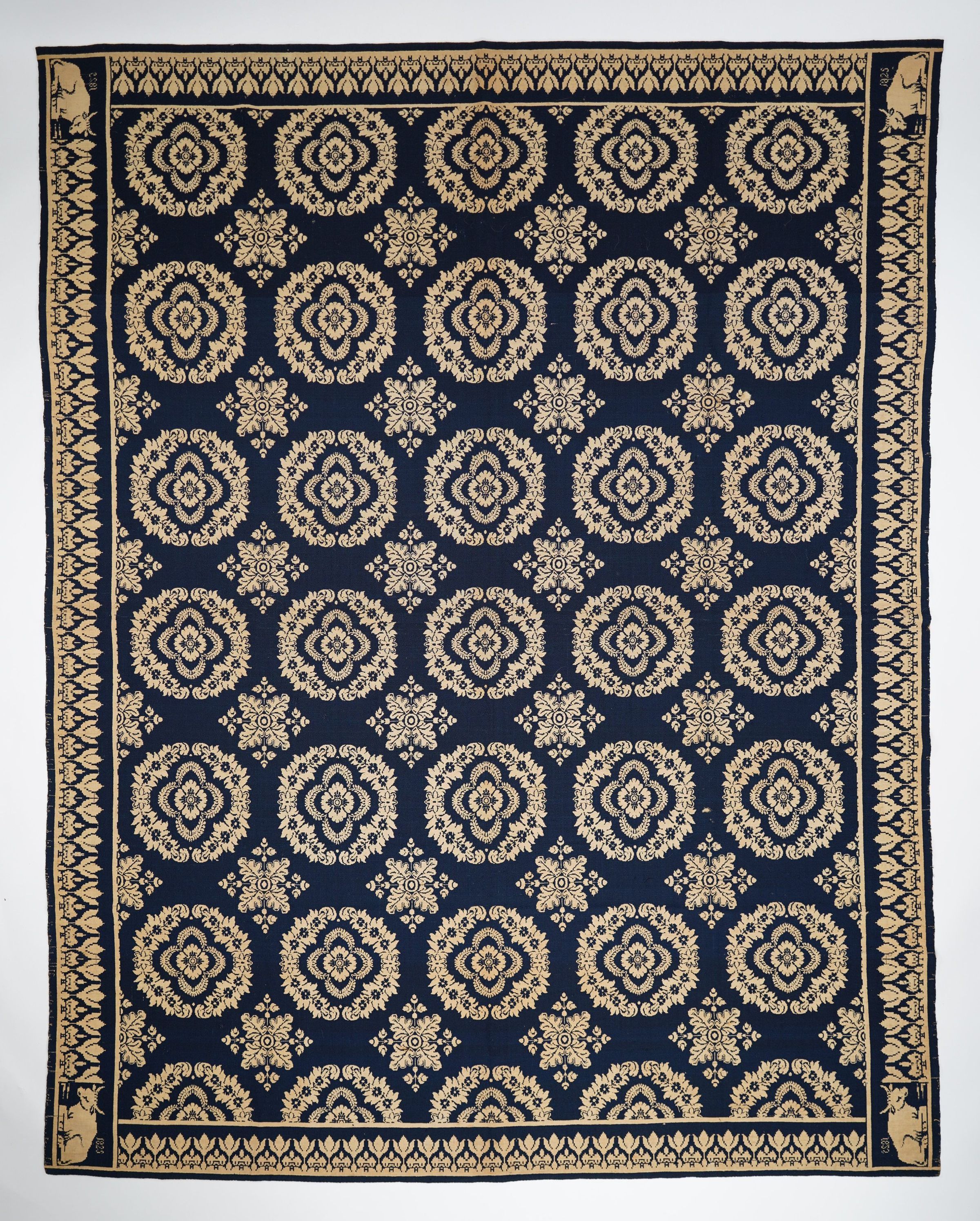 Navy and natural figured double weave coverlet; seamless; no fringe; tulip border on all four sides; medallion centerfield pattern and recumbent cow.Collection