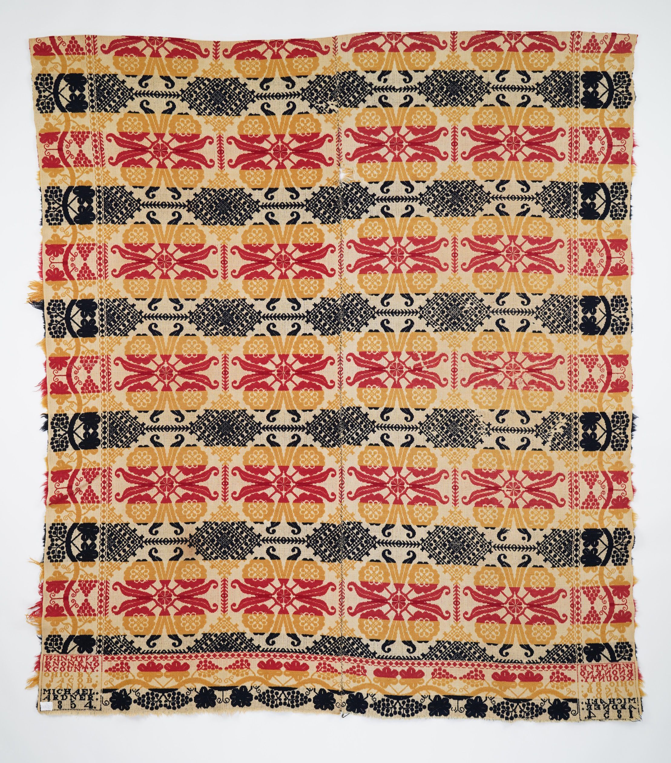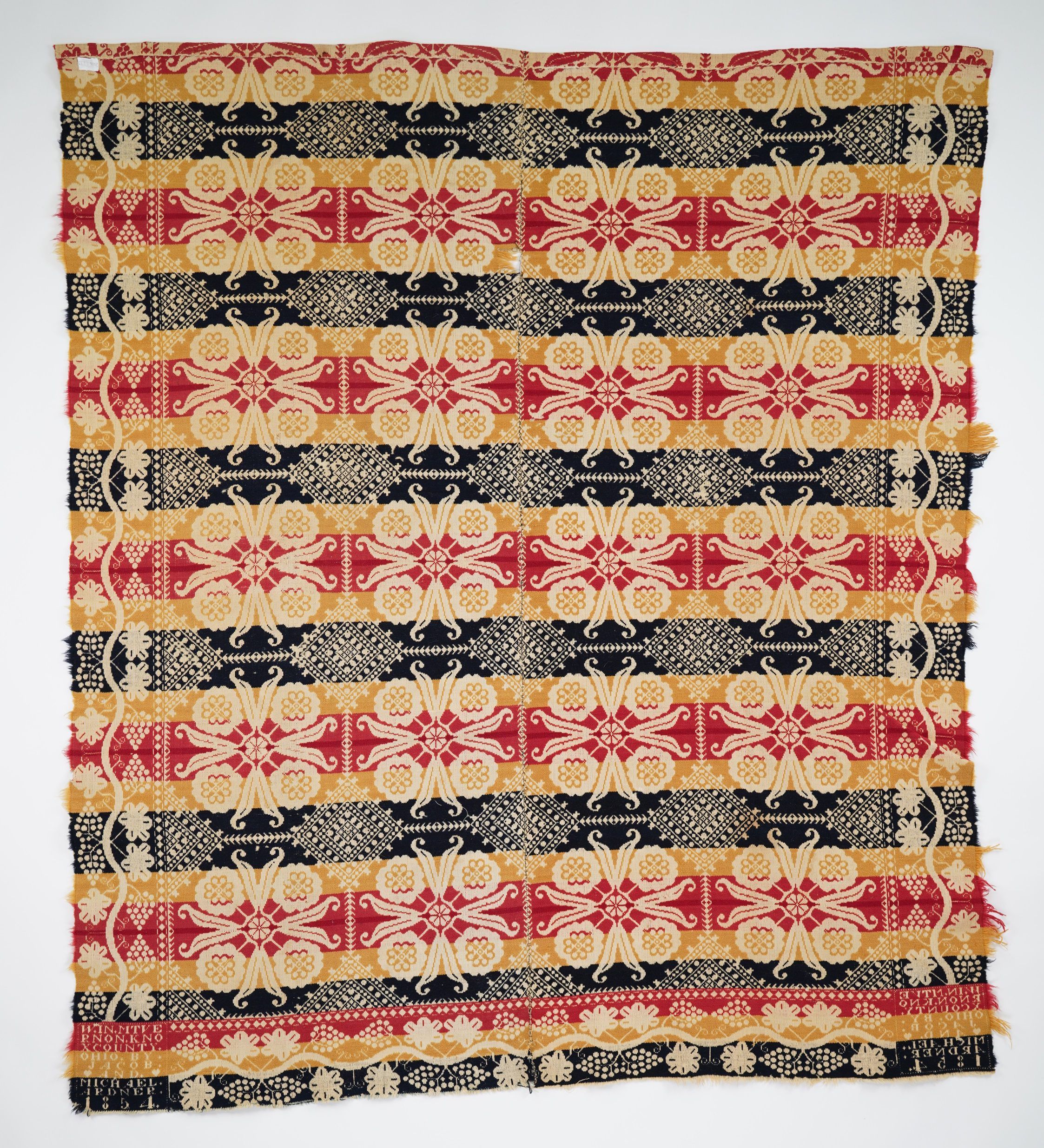 navy, red, yellow figured Tied Beiderwand coverlet; fringe on 3 sides; top edge is folded over; two corner blocks; two loom widths joined by a center seam; border of leaves and grape vines; centerfield has rows of floral medallions, strips of colorCollection