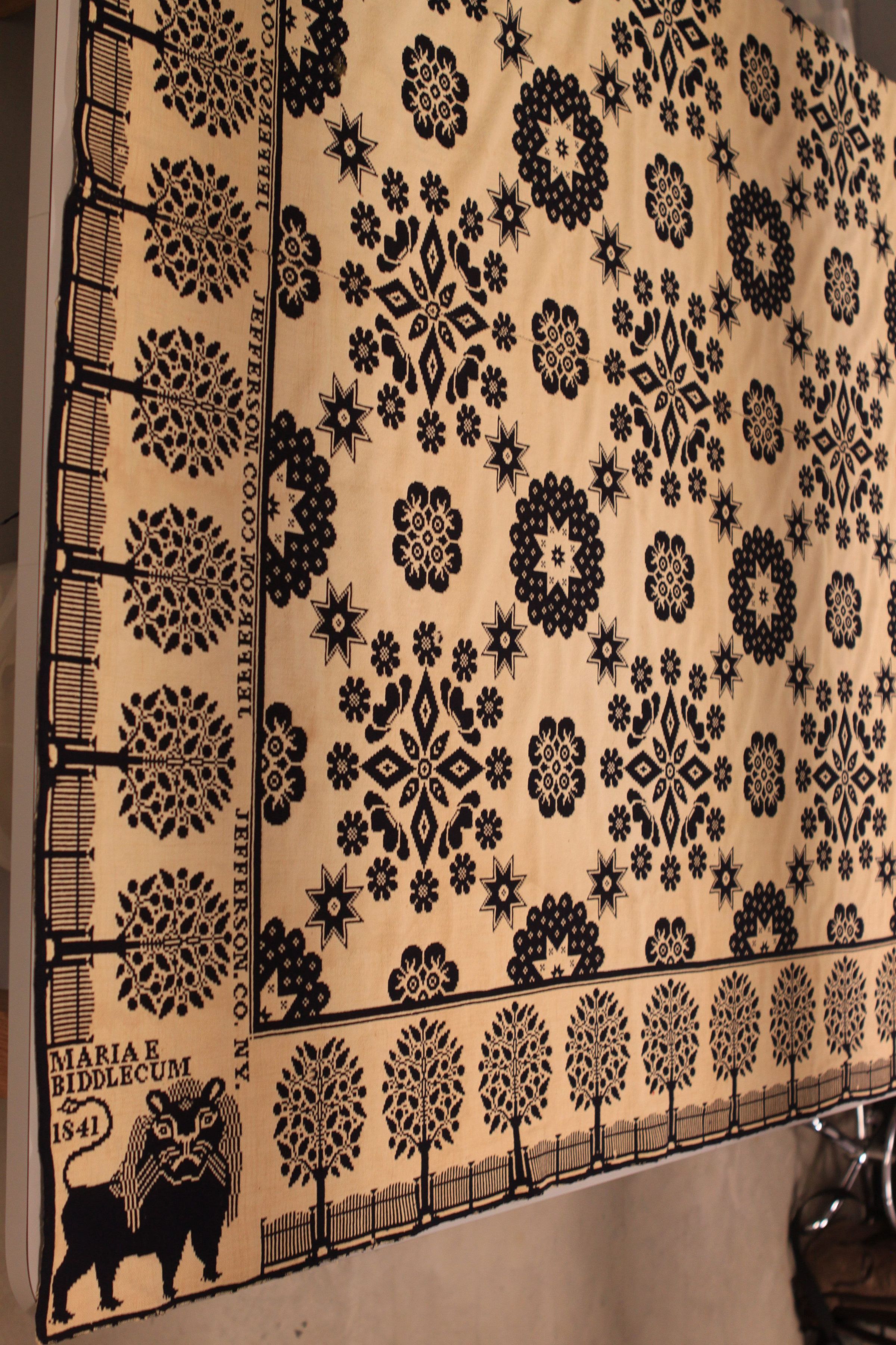 Double weave; navy and natural; no fringe; two loom widths joined; border on 3 sides of tree and picket fence; corner blocks on bottom 2 have chubby lion and inscription; lower border has inscription; centerfield has diamond flowers surrounded by circle of small flowers and stars betweenCollection
