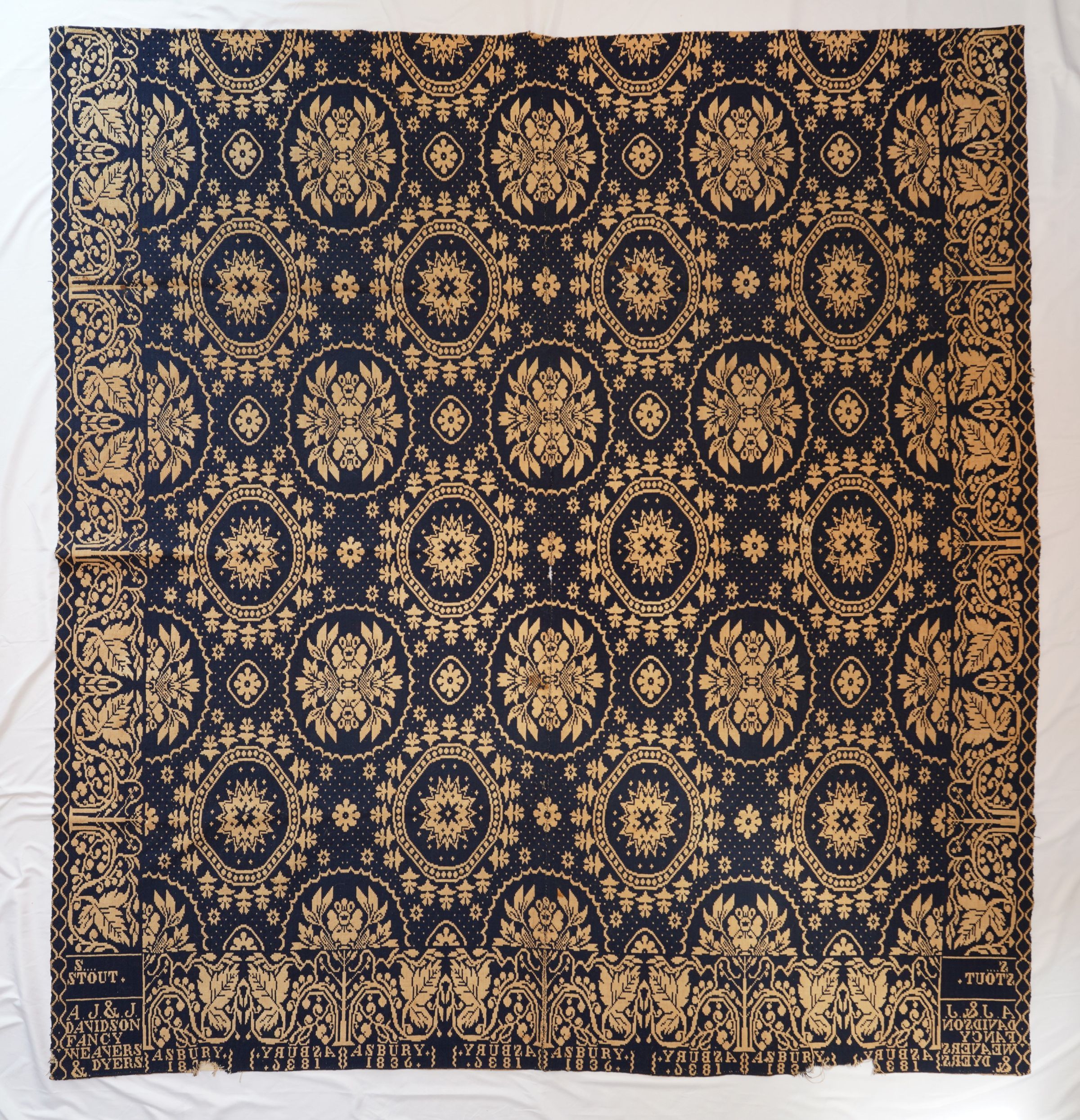 Natural and navy figured double weave coverlet; two panels joined by a center seam. Border on three sides, no fringe.