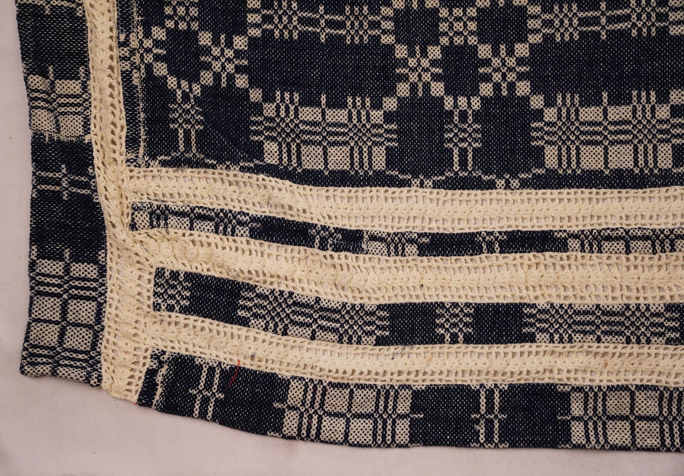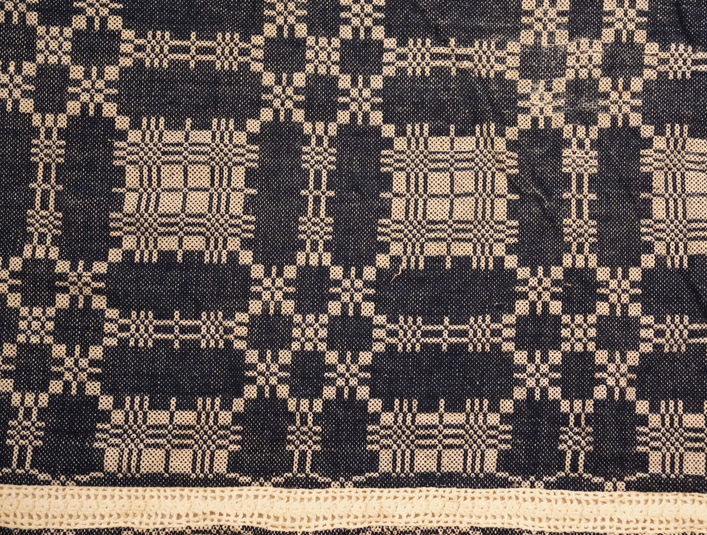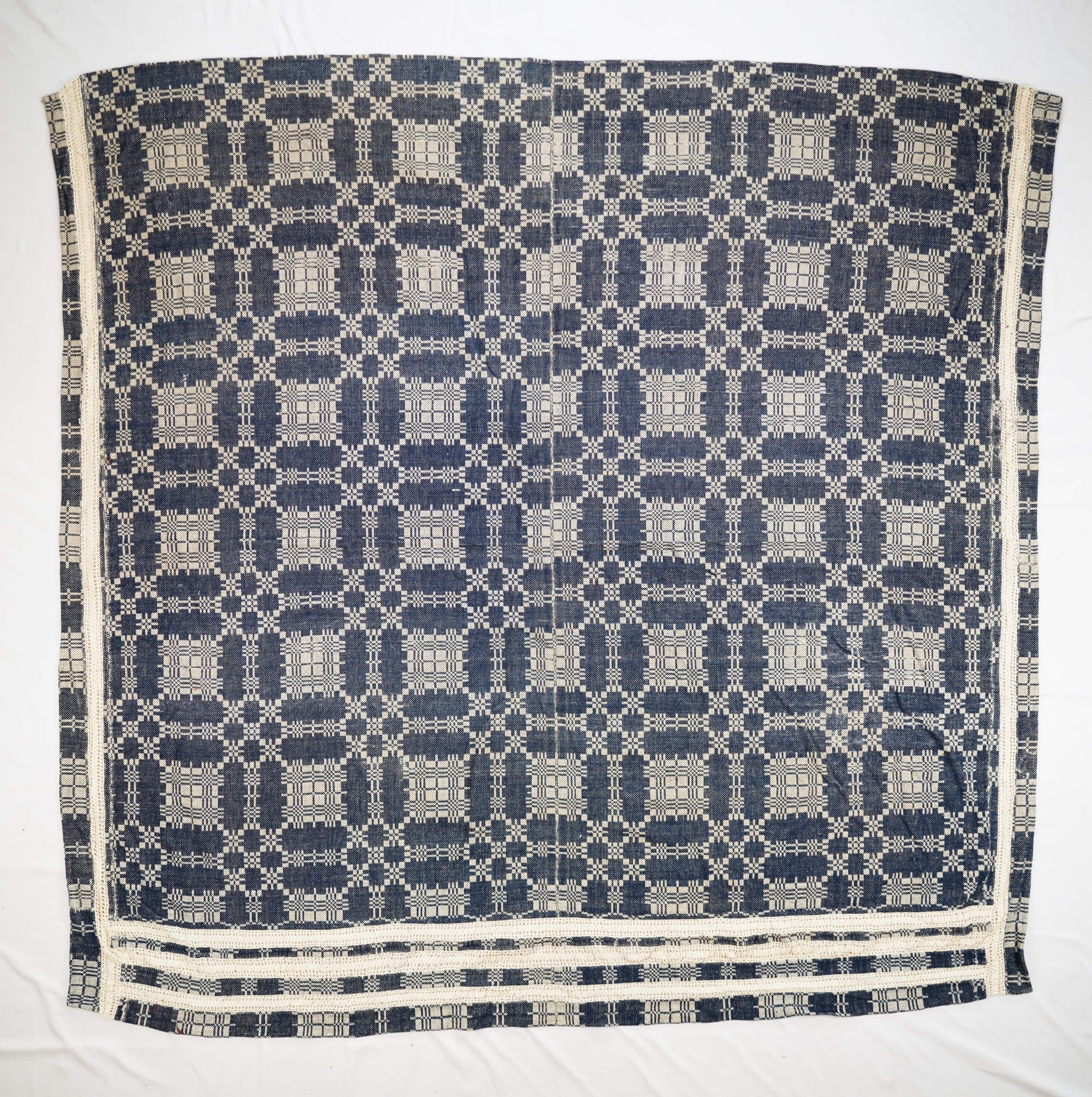 Natural and navy geometric summer and winter coverlet; two panels joined by a center seam. No fringe; border on three sides.
