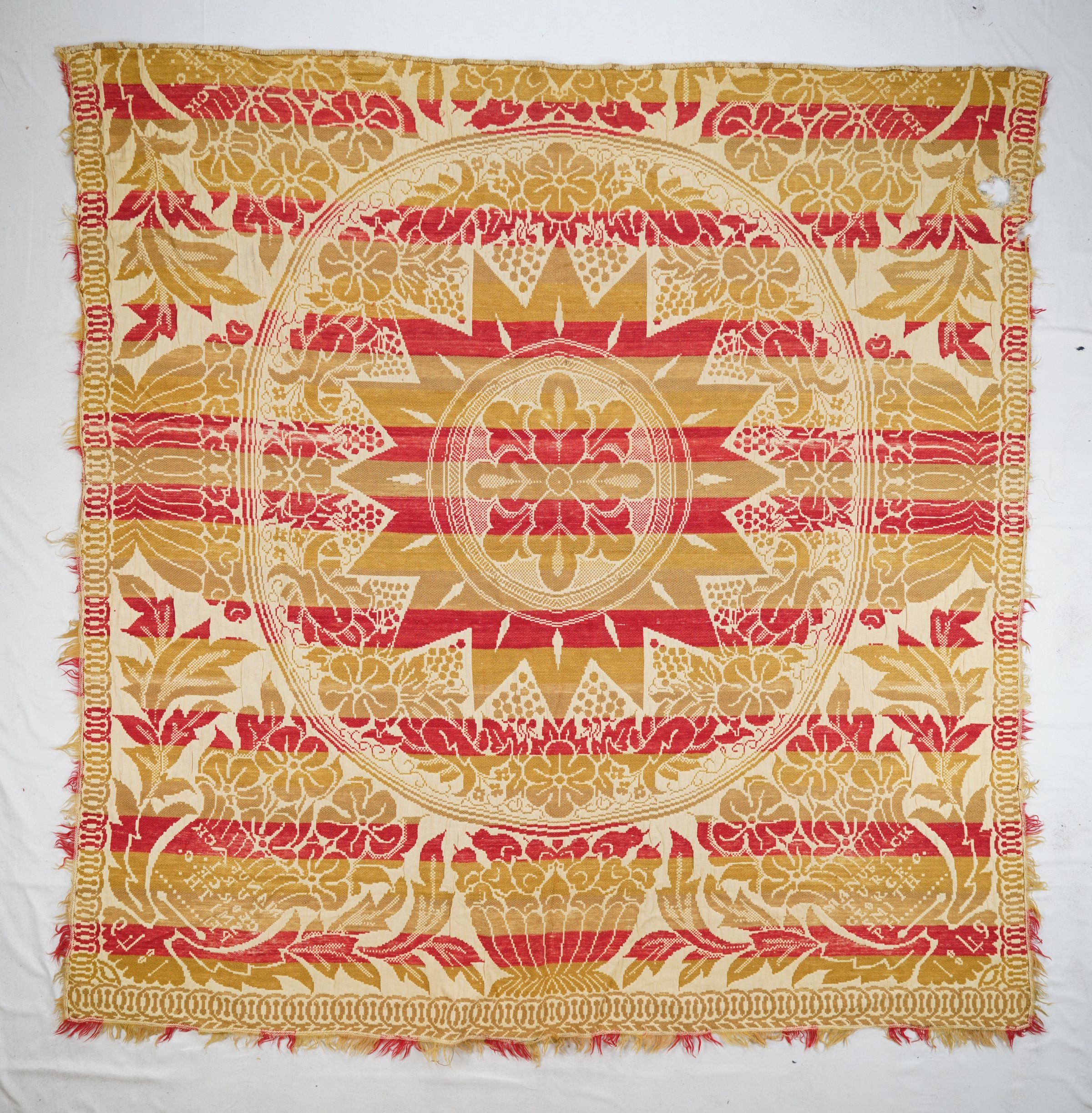Natural, tan, yellow, and red figured true beiderwand coverlet; seamless. Fringe and border on three sides.Collection